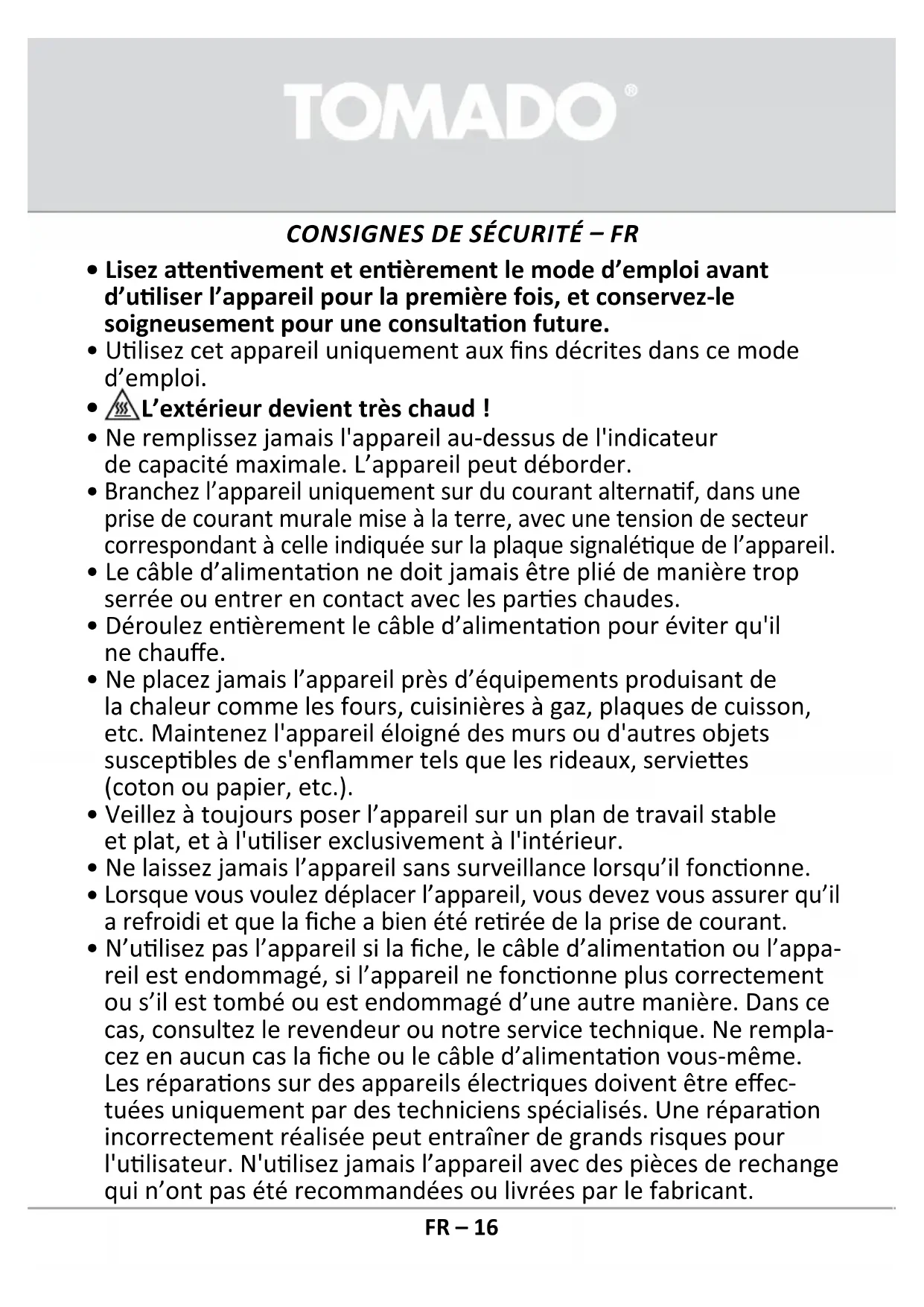 Rendez-vous sur www.tomado.com/support pour acheter des accessoires ou des pièces de rechange.