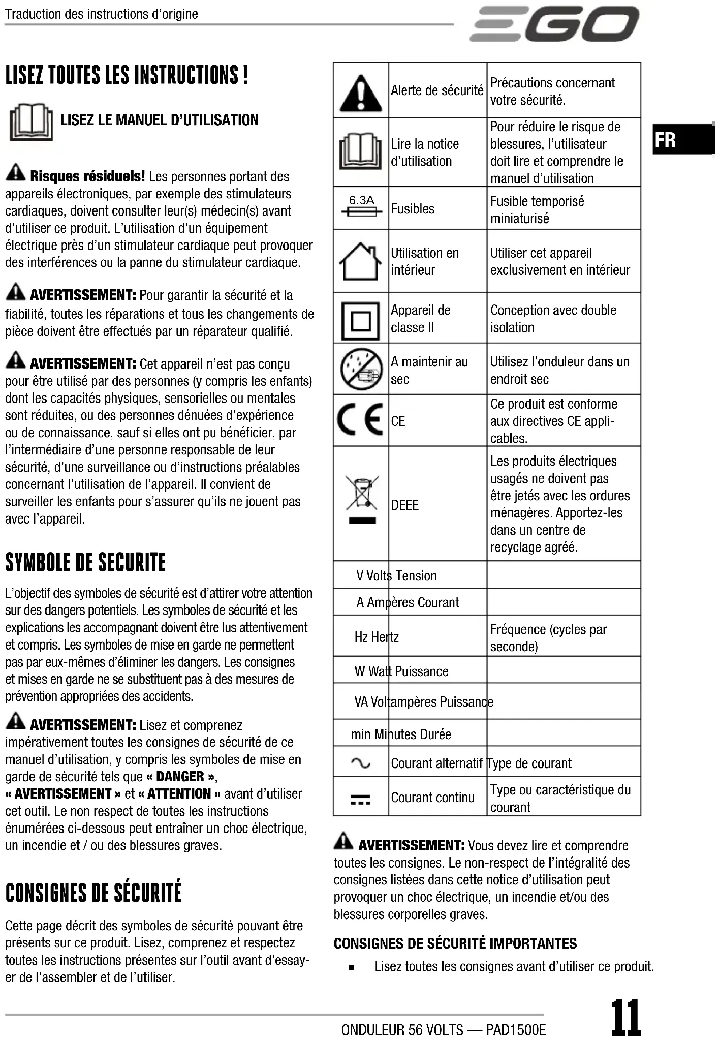 ◾ Lisez toutes les consignes avant d’utiliser ce produit. Traduction des instructions d’origineONDULEUR 56 VOLTS — PAD1500E12