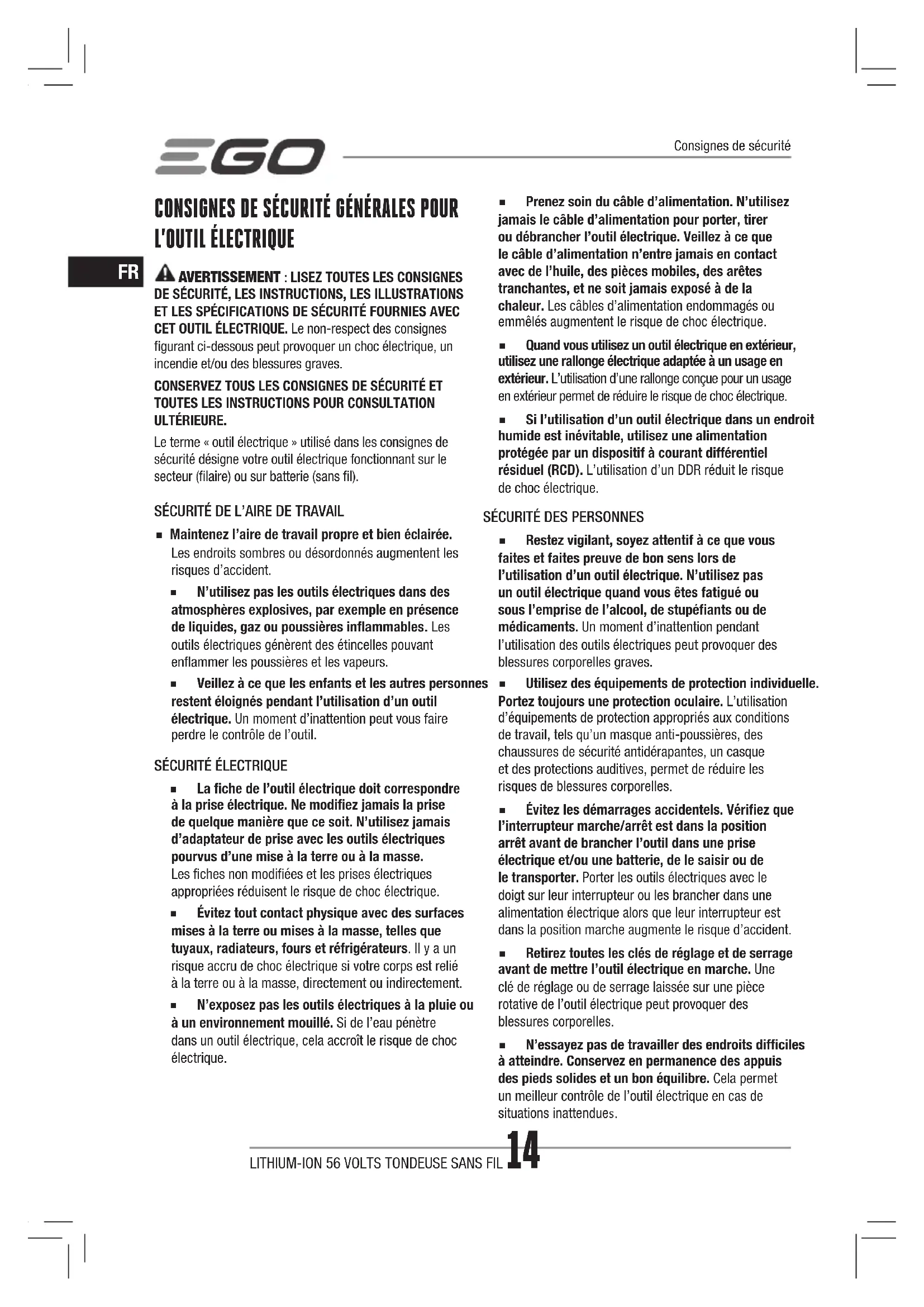 ◾ Restez vigilant, soyez attentif à ce que vous faites et faites preuve de bon sens lors de l’utilisation d’un outil électrique. N’utilisez pas un outil électrique quand vous êtes fatigué ou sous l’emprise de l’alcool, de stupéants ou de médicaments. Un moment d’inattention pendant l’utilisation des outils électriques peut provoquer des blessures corporelles graves. ◾ Utilisez des équipements de protection individuelle. Portez toujours une protection oculaire. L’utilisation d’équipements de protection appropriés aux conditions de travail, tels qu’un masque anti-poussières, des chaussures de sécurité antidérapantes, un casque et des protections auditives, permet de réduire les risques de blessures corporelles. ◾ Évitez les démarrages accidentels. Vériez que l’interrupteur marche/arrêt est dans la position arrêt avant de brancher l’outil dans une prise électrique et/ou une batterie, de le saisir ou de le transporter. Porter les outils électriques avec le doigt sur leur interrupteur ou les brancher dans une alimentation électrique alors que leur interrupteur est dans la position marche augmente le risque d’accident. ◾ Retirez toutes les clés de réglage et de serrage avant de mettrel’outil électrique en marche. Une clé de réglage ou de serrage laissée sur une pièce rotative de l’outil électrique peut provoquer des blessures corporelles. ◾ N’essayez pas de travailler des endroits difciles à atteindre. Conservez en permanence des appuis des pieds solides et un bon équilibre. Cela permet un meilleur contrôle de l’outil électrique en cas de situations inattendues.Consignes de sécuritéLITHIUM-ION 56 VOLTS TONDEUSE SANS FIL 15
