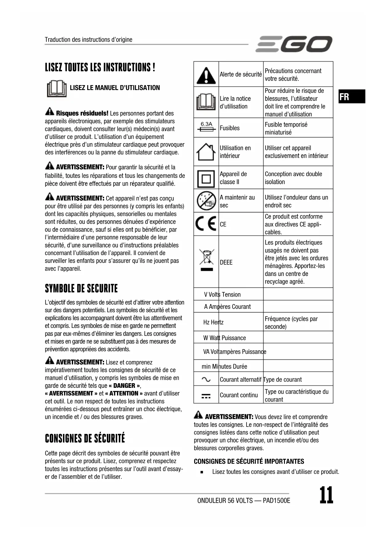 ◾ Lisez toutes les consignes avant d’utiliser ce produit. Traduction des instructions d’origineONDULEUR 56 VOLTS — PAD1500E12