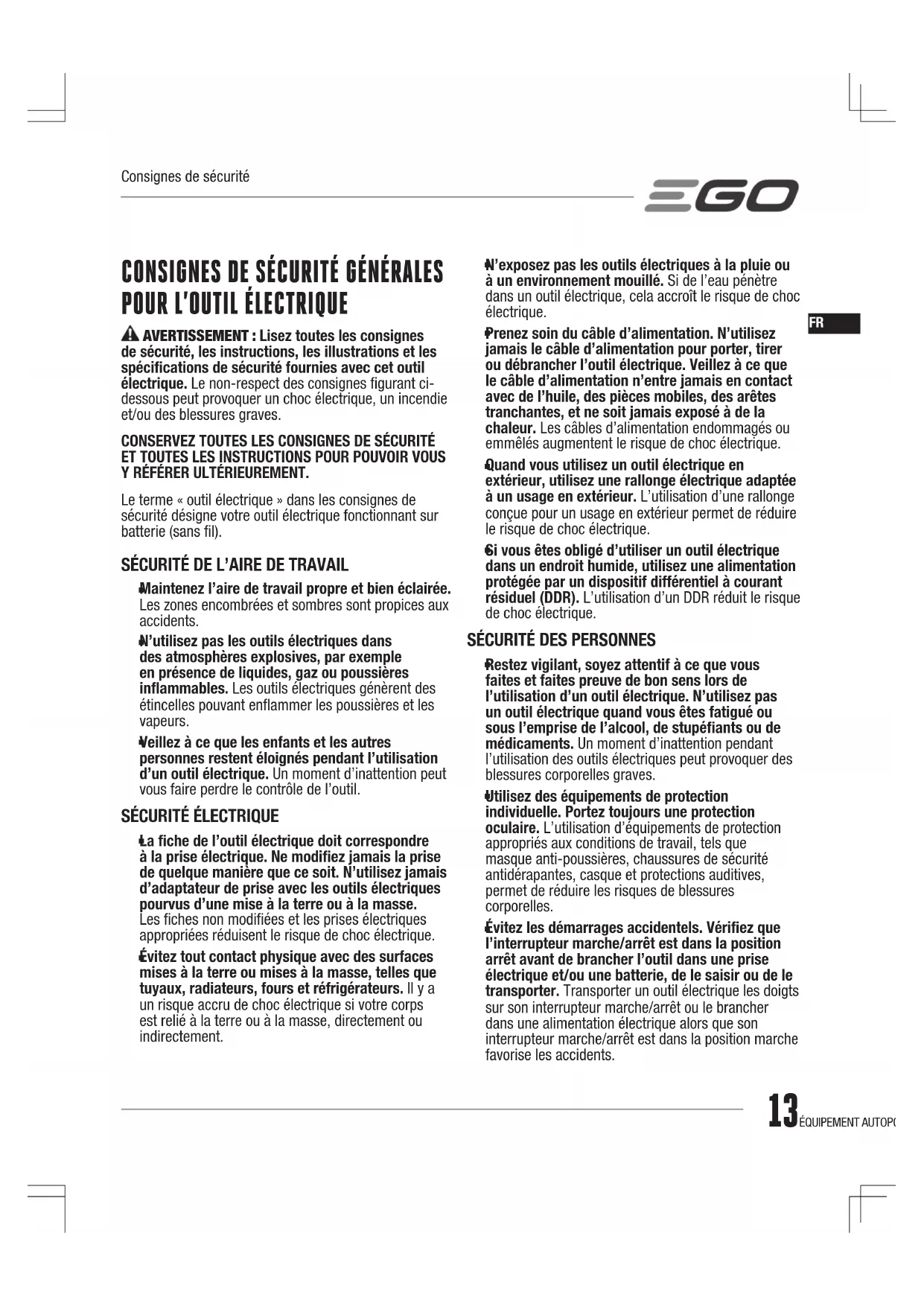 Si des situations non décrites par ce manuel se produisent, faites preuve de prudence et de bon sens. Contactez le service client EGO pour obtenir des conseils.