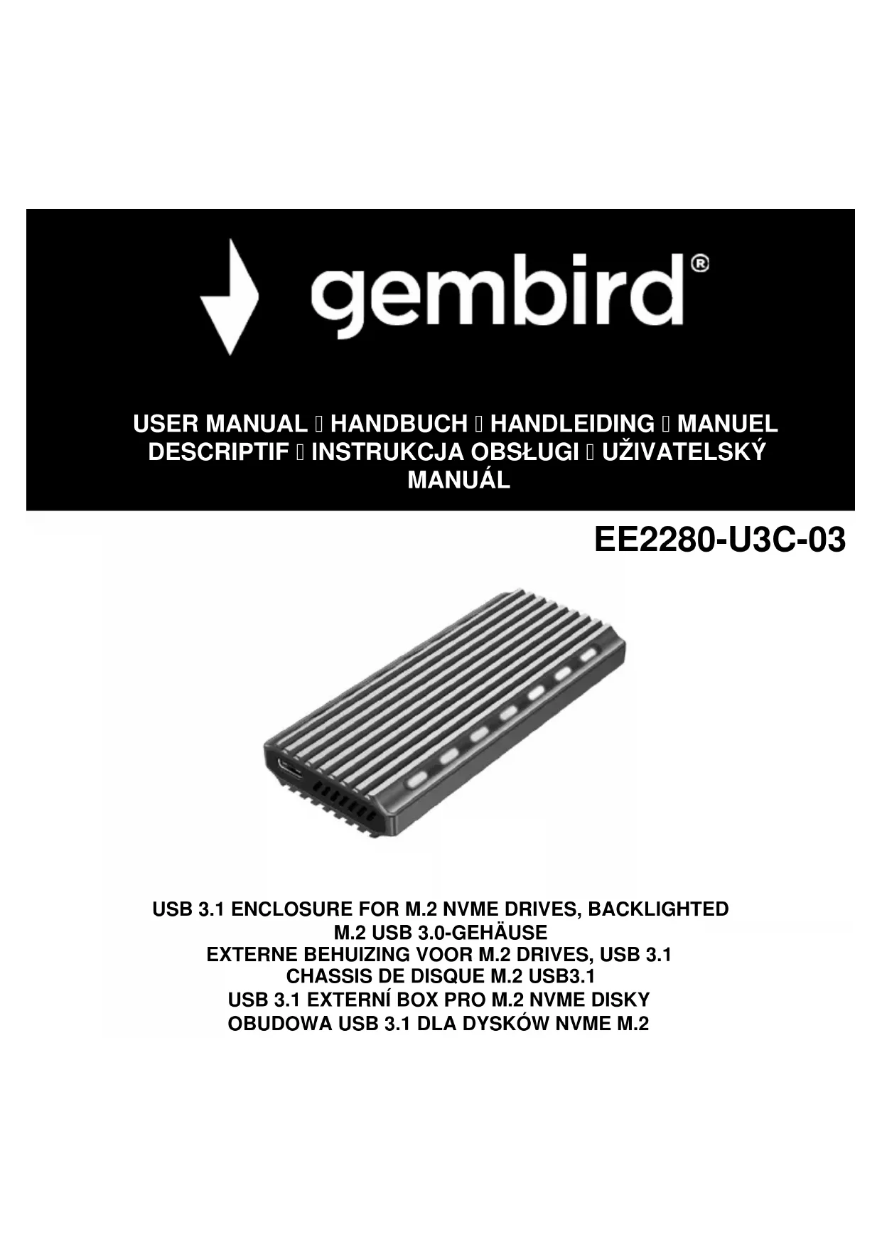 Le reçu doit indiquer clairement la date d'achat et le numéro de pièce, en plus il doit être imprimé. Conservez le reçu pendant toute la période de garantie, car il est requis pour toutes les réclamations de garantie. Pendant la période de garantie, les articles défectueux seront crédités, réparés ou remplacés aux frais du fabricant. Les travaux effectués sous la garantie ne prolongent pas la période de garantie ni ne commencent une nouvelle période de garantie. Le fabricant se réserve le droit d'annuler toute demande de garantie pour dommages ou défauts dus à une mauvaise utilisation, un abus ou un impact externe (chute, impact, pénétration d'eau, poussière, contamination ou rupture). Les pièces d'usure (par exemple les piles rechargeables) sont exclues de la garantie. À la réception des marchandises RMA, Gembird Europe B.V.se réserve le droit de choisir entre le remplacement des marchandises défectueuses ou l'émission d'une note de crédit. Le montant de la note de crédit sera toujours calculé sur la base de la valeur marchande actuelle des produits défectueux. Gembird Europe B.V. Wittevrouwen 56, 1358CD Almere, Pays-Bas www.gembird.nl/service9 EE2280-U3C-03 USB 3.1 ENCLOSURE FOR M.2 NVME DRIVES, BACKLIGHTED GEMBIRD EUROPE B.V. http://www.gembird.eu All brands and logos are registered trademarks of their respective owners