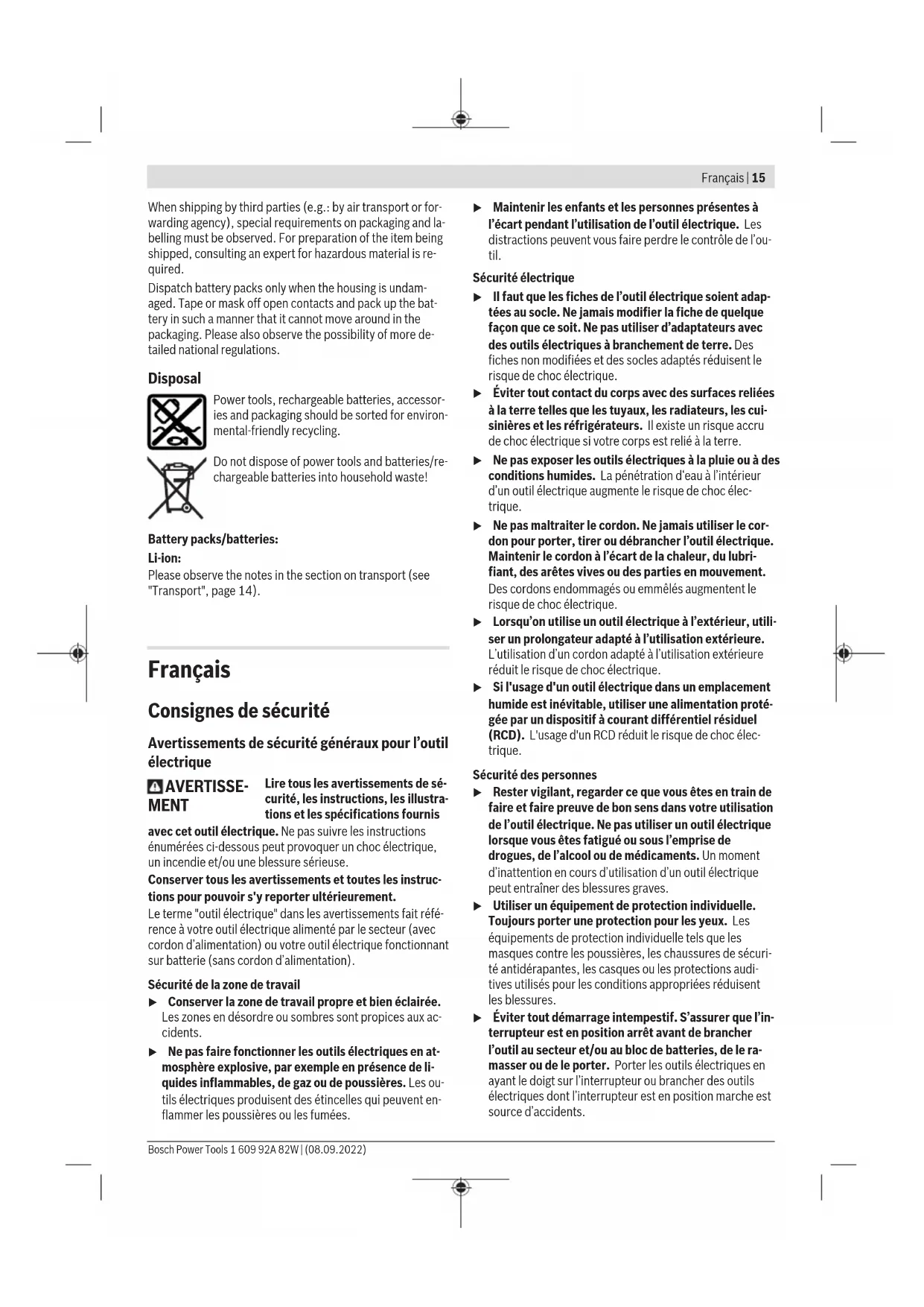 Low Energy Module is fitted with a coin cell. You will be notified via the Bosch Toolbox app if the coin cell is too weak or if it is drained. The coin cell replacement must be performed by Bosch or by an after-sales service centre authorised to work with Bosch power tools. u Caution: The coin cell must always be replaced with a coin cell of the same type. There is a risk of explosion. u Remove and dispose of drained coin cell correctly. Drained coin cell may leak and damage the product or cause personal injury. After-Sales Service and Application Service Our after-sales service responds to your questions concern- ing maintenance and repair of your product as well as spare parts. You can find explosion drawings and information on spare parts at: www.bosch-pt.com The Bosch product use advice team will be happy to help you with any questions about our products and their accessor- ies. In all correspondence and spare parts orders, please always include the 10‑digit article number given on the nameplate of the product. Malaysia Robert Bosch Sdn. Bhd.(220975-V) PT/SMY No. 8A, Jalan 13/6 46200 Petaling Jaya Selangor Tel.: (03) 79663194 Toll-Free: 1800 880188 Fax: (03) 79583838 E-Mail: kiathoe.chong@my.bosch.com www.bosch-pt.com.my You can find further service addresses at: www.bosch-pt.com/serviceaddresses Transport The recommended lithium-ion batteries are subject to legis- lation on the transport of dangerous goods. The user can transport the batteries by road without further require- ments. 1 609 92A 82W | (08.09.2022) Bosch Power ToolsFrançais | 15 When shipping by third parties (e.g.: by air transport or for- warding agency), special requirements on packaging and la- belling must be observed. For preparation of the item being shipped, consulting an expert for hazardous material is re- quired. Dispatch battery packs only when the housing is undam- aged. Tape or mask off open contacts and pack up the bat- tery in such a manner that it cannot move around in the packaging. Please also observe the possibility of more de- tailed national regulations. Disposal Power tools, rechargeable batteries, accessor- ies and packaging should be sorted for environ- mental-friendly recycling. Do not dispose of power tools and batteries/re- chargeable batteries into household waste! Battery packs/batteries: Li-ion: Please observe the notes in the section on transport (see "Transport", page14). Français Consignes de sécurité Avertissements de sécurité généraux pour l’outil électrique AVERTISSE- MENT Lire tous les avertissements de sé- curité, les instructions, les illustra- tions et les spécifications fournis avec cet outil électrique. Ne pas suivre les instructions énumérées ci-dessous peut provoquer un choc électrique, un incendie et/ou une blessure sérieuse. Conserver tous les avertissements et toutes les instruc- tions pour pouvoir s'y reporter ultérieurement. Le terme "outil électrique" dans les avertissements fait réfé- rence à votre outil électrique alimenté par le secteur (avec cordon d’alimentation) ou votre outil électrique fonctionnant sur batterie (sans cordon d’alimentation). Sécurité de la zone de travail u Conserver la zone de travail propre et bien éclairée. Les zones en désordre ou sombres sont propices aux ac- cidents. u Ne pas faire fonctionner les outils électriques en at- mosphère explosive, par exemple en présence de li- quides inflammables, de gaz ou de poussières. Les ou- tils électriques produisent des étincelles qui peuvent en- flammer les poussières ou les fumées. u Maintenir les enfants et les personnes présentes à l’écart pendant l’utilisation de l’outil électrique. Les distractions peuvent vous faire perdre le contrôle de l’ou- til. Sécurité électrique u Il faut que les fiches de l’outil électrique soient adap- tées au socle. Ne jamais modifier la fiche de quelque façon que ce soit. Ne pas utiliser d’adaptateurs avec des outils électriques à branchement de terre. Des fiches non modifiées et des socles adaptés réduisent le risque de choc électrique. u Éviter tout contact du corps avec des surfaces reliées à la terre telles que les tuyaux, les radiateurs, les cui- sinières et les réfrigérateurs. Il existe un risque accru de choc électrique si votre corps est relié à la terre. u Ne pas exposer les outils électriques à la pluie ou à des conditions humides. La pénétration d‘eau à l’intérieur d’un outil électrique augmente le risque de choc élec- trique. u Ne pas maltraiter le cordon. Ne jamais utiliser le cor- don pour porter, tirer ou débrancher l’outil électrique. Maintenir le cordon à l’écart de la chaleur, du lubri- fiant, des arêtes vives ou des parties en mouvement. Des cordons endommagés ou emmêlés augmentent le risque de choc électrique. u Lorsqu’on utilise un outil électrique à l’extérieur, utili- ser un prolongateur adapté à l’utilisation extérieure. L’utilisation d’un cordon adapté à l’utilisation extérieure réduit le risque de choc électrique. u Si l'usage d'un outil électrique dans un emplacement humide est inévitable, utiliser une alimentation proté- gée par un dispositif à courant différentiel résiduel (RCD). L'usage d'un RCD réduit le risque de choc élec- trique. Sécurité des personnes u Rester vigilant, regarder ce que vous êtes en train de faire et faire preuve de bon sens dans votre utilisation de l’outil électrique. Ne pas utiliser un outil électrique lorsque vous êtes fatigué ou sous l’emprise de drogues, de l’alcool ou de médicaments. Un moment d’inattention en cours d’utilisation d’un outil électrique peut entraîner des blessures graves. u Utiliser un équipement de protection individuelle. Toujours porter une protection pour les yeux. Les équipements de protection individuelle tels que les masques contre les poussières, les chaussures de sécuri- té antidérapantes, les casques ou les protection