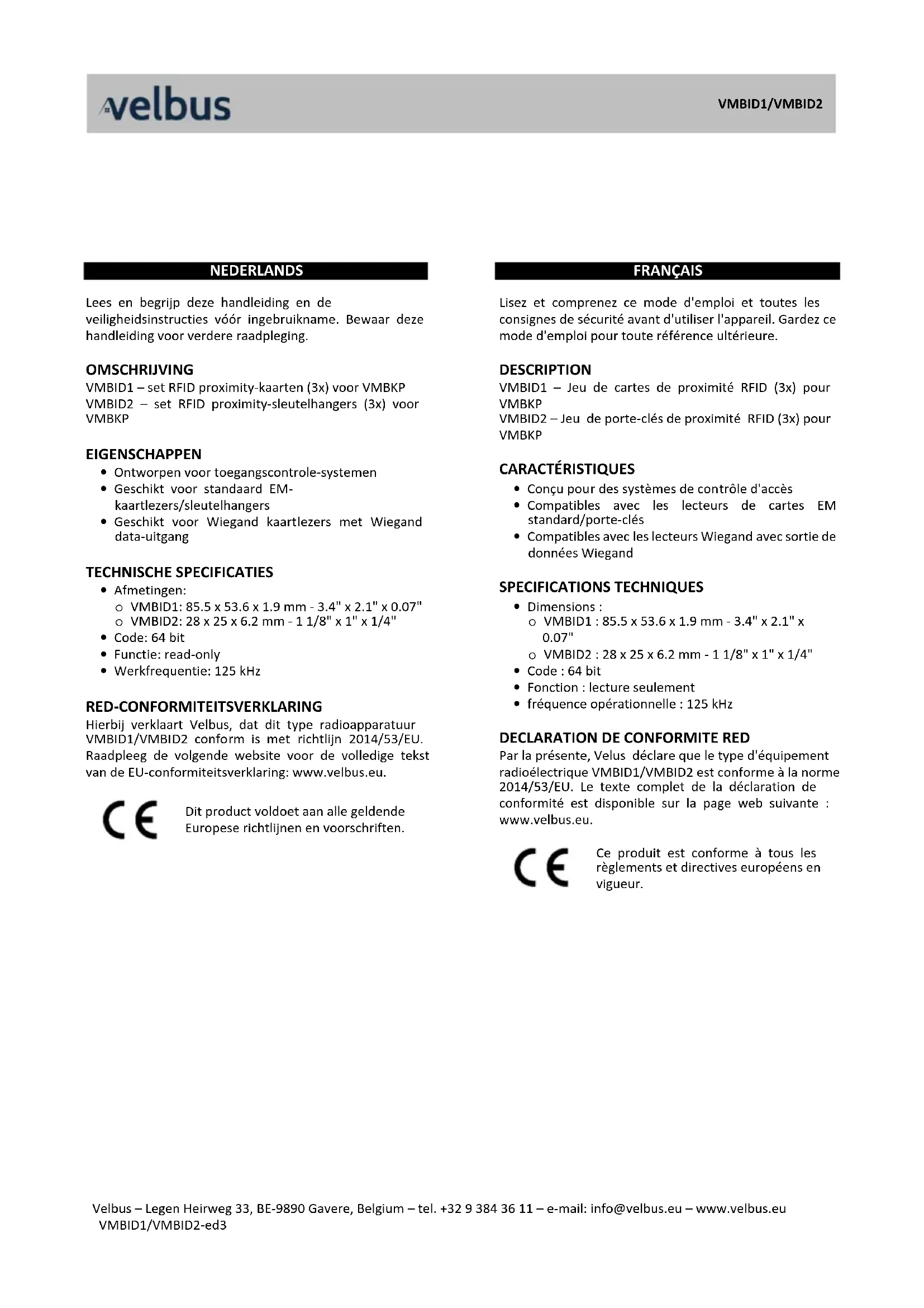 Ce produit est conforme à tous les règlements et directives européens en vigueur.VMBID1/VMBID2 Velbus – Legen Heirweg 33, BE-9890 Gavere, Belgium – tel. +32 9 384 36 11 – e-mail: info@velbus.eu – www.velbus.eu VMBID1/VMBID2-ed3