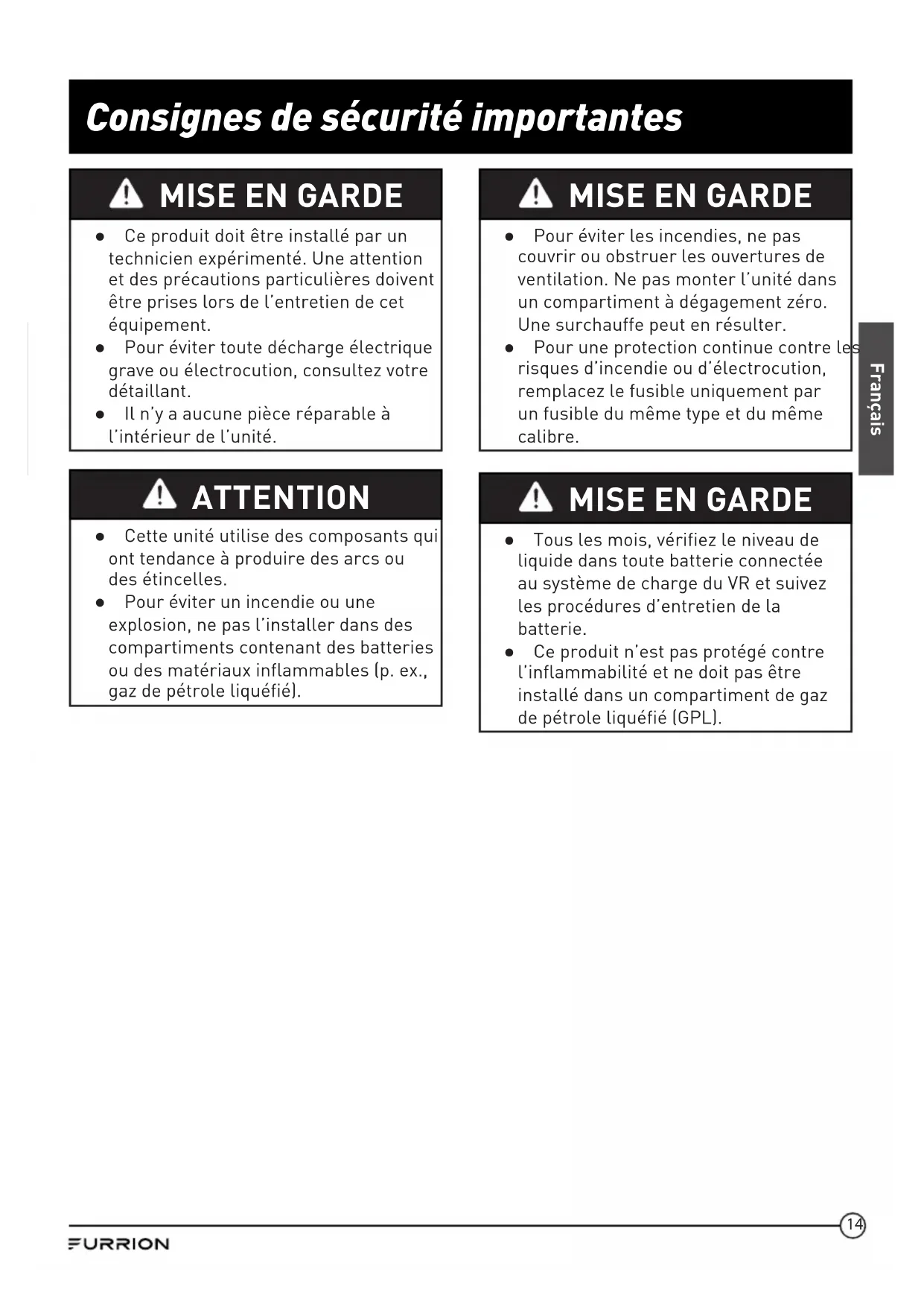 - . Avant d’utiliser votre nouveau produit, veuillez lire ces instructions attentivement. Vous serez ainsi assuré d’utiliser ce produit de manière sécuritaire tout en réduisant les risques de blessures. Ce manuel d’instructions contient des renseignements portant sur l’installation, l’entretien du produit et son utilisation sécuritaire. Veuillez conserver ces instructions en lieu sûr pour pouvoir les consulter ultérieurement. N’oubliez pas de remettre ce manuel à tout nouveau propriétaire de ce produit. Le fabricant n’accepte aucune responsabilité quant aux dommages causés à la suite du non- respect de ces instructions. Pour toute question sur nos produits, veuillez communiquer avec nous à l’adresse: support@furrion.com13 Contenu Français Bienvenue p. 14