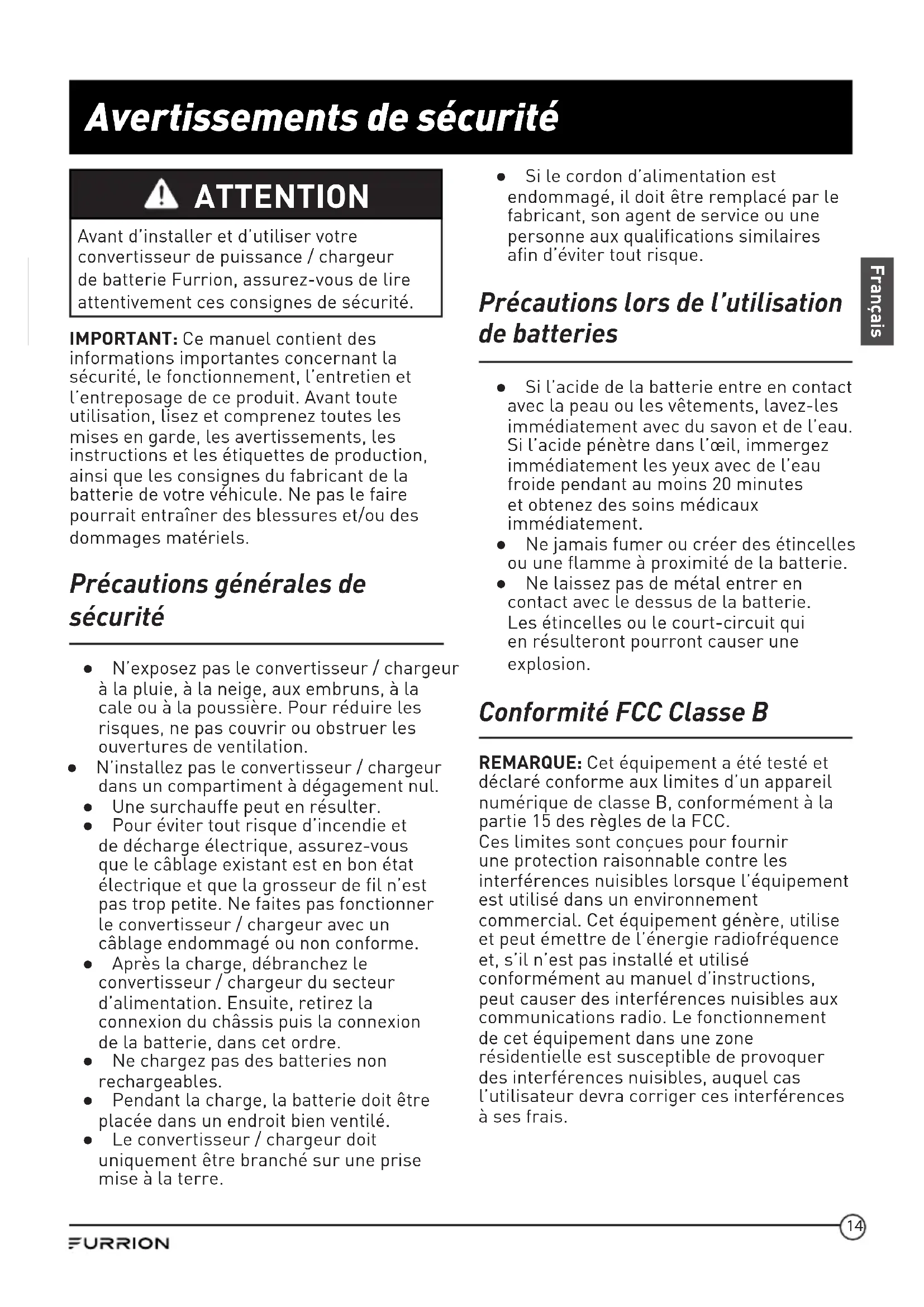 Merci et félicitations pour l'achat de ce convertisseur Furrion® 60A / 80A. Avant d'utiliser votre nouveau produit, veuillez lire ces instructions attentivement. Vous serez ainsi assuré de utiliser ce produit de manière sécuritaire tout en réduisant les risques de blessures. Ce manuel d'instructions contient des renseignements portant sur l'installation, l'entretien du produit et son utilisation sécuritaire.