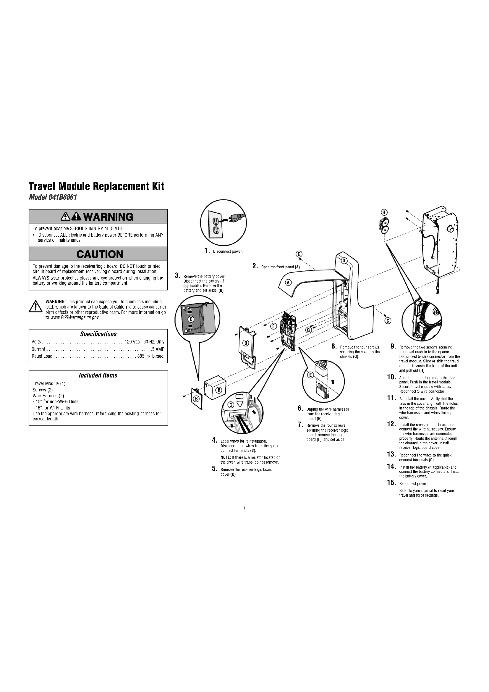 Disconnect the battery (if applicable). Remove the battery and set aside. (B) Included Items Travel Module (1) Screws (2) Wire Harness (2) - 10” for non-Wi-Fi Units - 16” for Wi-Fi Units Use the appropriate wire harness, referencing the existing harness for correct length. 1Trousse de remplacement de module de course Modéle 041B8861 Caractéristiques techniques V ..............................120V c.a. - 60Hz, uniquement Courant...............................................1,5ACharge nominale...................................385po/lb/sPour éviter des BLESSURES GRAVES, VOIRE MORTELLES:• Débrancher TOUTE alimentation électrique et la batterie AVANT d’effectuer TOUT entretien ou TOUTE intervention.Pour empêcher tout dommage à la carte logique/au récepteur, NE PAS toucher le circuit imprimé du récepteur/de la carte logique de remplacement durant l’installation.Porter TOUJOURS des gants de protection et des lunettes de sécurité lors du remplacement de la batterie ou d’une intervention à proximité du compartiment de la batterie.AVERTISSEMENT : Ce produit peut vous exposer à des produits chimiques comme le plomb, reconnu par l’État de la Californie comme cause de cancers, d’anomalies congénitales et d’autres problèmes liés à la reproduction. Pour plus d’informations, visitez www.P65Warnings.ca.gov