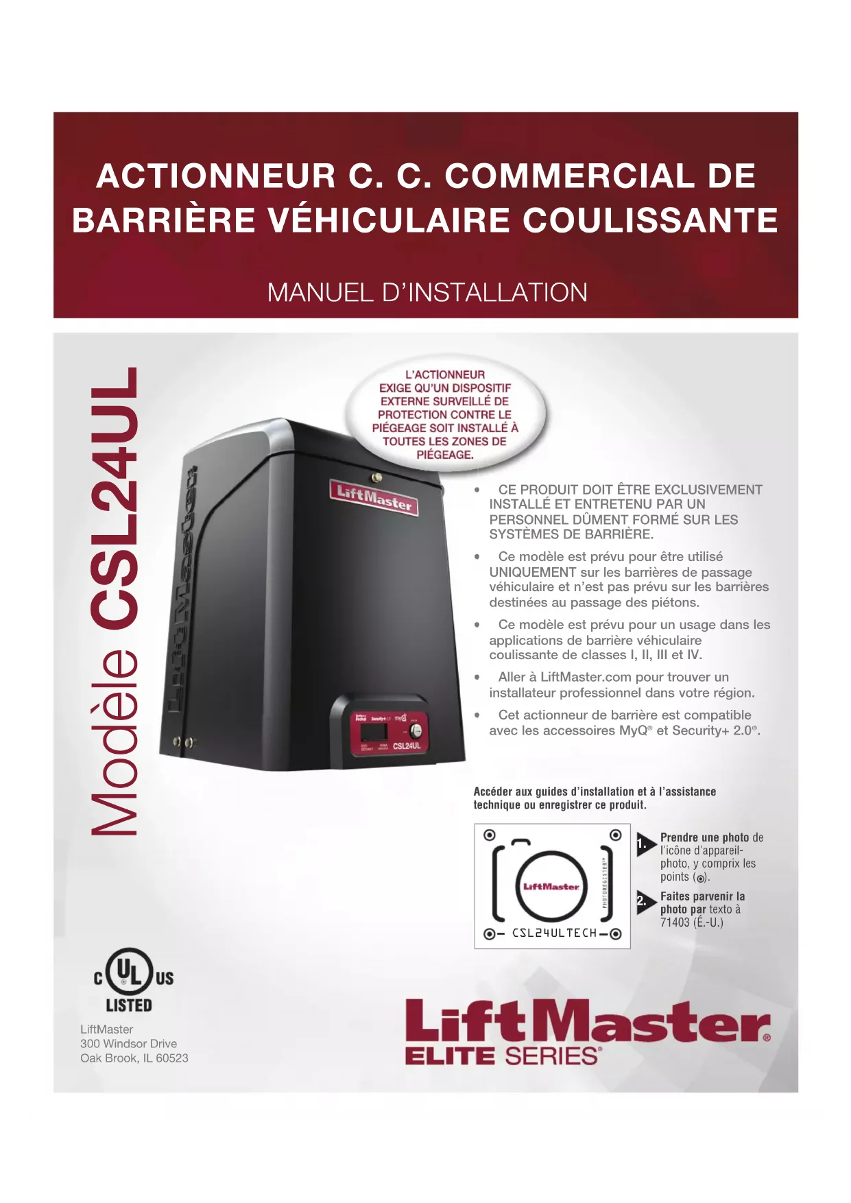 Modèle KPW250 Récepteur de contrôle d’accès commercial Récepteur de contrôle d’accès pour jusqu’à 1000dispositifs (toute combinaison de télécommandes et de dispositifs sans fil d’entrée sans clé). Modèle STAR1000 ACCESSOIRES53 Divers Plaque de montage sur poteau Pour les modèles à montage sur poteau CSL24UL, CSW24UL CSW200UL et les actionneurs de barrière commerciaux SL3000UL. Poteaux non inclus. Modèle MPEL Trousse de rallonge d’antenne à distance La trousse de rallonge d’antenne à distance permet d’installer l’antenne à distance. Modèle 86LM Boucle de détection enfichable Faible consommation. Se branche commodément dans la carte logique existante. Modèle LOOPDETLM Boucle de détection Boucles de détection à faible consommation d’énergie, montées et câblées séparément à l’intérieur du boîtier de commande. Accessoire à faible consommation d’énergie LiftMaster. Modèle LD7LP Sonde de détection de véhicule La sonde de détection de véhicule est enfouie dans le sol et peut détecter un véhicule à mesure qu’il s’approche de la barrière. Elle ouvrira ensuite la barrière. Modèle CP3 Trousse de panneau solaire Cette trousse remplace ou ajoute un panneau solaire à l’application d’actionneur. 60W maximum pour les actionneurs de 24V c.c. et 30W maximum pour les actionneurs de 12V c.c. Nécessite un faisceau de fils de batterie 33AH. Modèles SP10W12V (10W, 12V) et SP20W12V (20W, 12V) Serrure électromagnétique de barrière Serrure électromagnétique extérieure, transformateur, boîte de connexion, plaque de montage et quincaillerie. Usage non destiné aux applications solaires. Doit être alimenté séparément. Modèle MG1300 Chauffage L’appareil de chauffage maintient une température convenable pour le réducteur et les batteries lorsque la température extérieure est inférieure à -20°C (-4°F). Le thermostat DOIT être réglé à une température entre 7 et 15,5°C (45 et 60°F) pour assurer le bon fonctionnement de la barrière. L’appareil de chauffage peut être alimenté en c. a. de 110 à 250V. Modèle HTR Passerelle internet LiftMaster