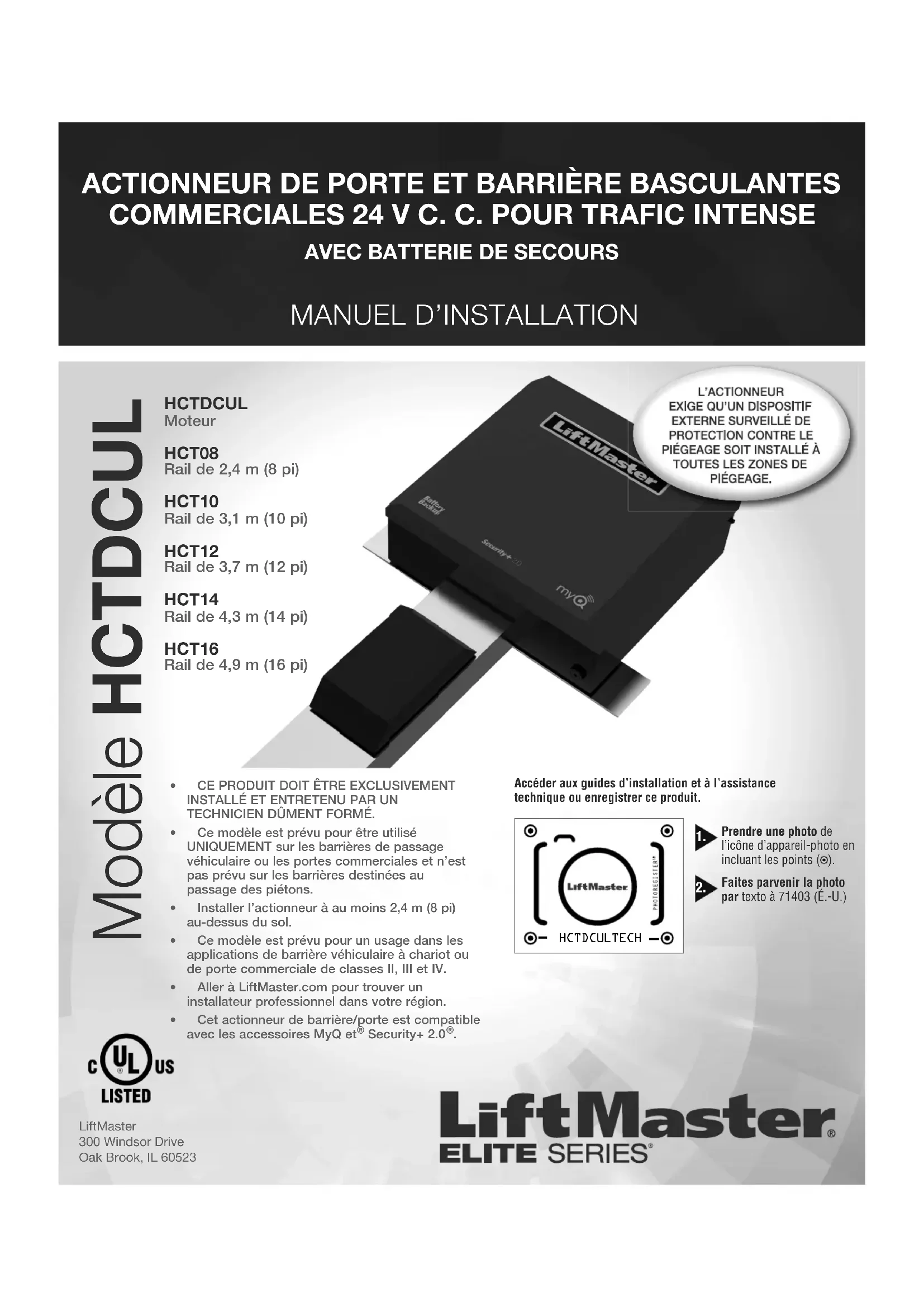 LiftMaster300 Windsor DriveOak Brook, IL 60523 HCTDCUL Moteur HCT08 Rail de 2,4 m (8 pi) HCT10 Rail de 3,1 m (10 pi) HCT12 Rail de 3,7 m (12 pi) HCT14 Rail de 4,3 m (14 pi) HCT16 Rail de 4,9 m (16 pi) HCTDCULTECHAccéder aux guides d’installation et à l’assistance technique ou enregistrer ce produit.Faites parvenir la photo par texto à 71403 (É.-U.)Prendre une photo de l’icône d’appareil-photo en incluant les points (