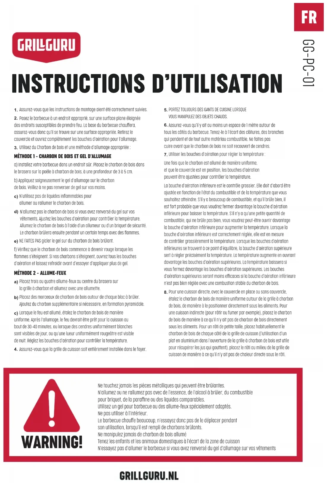 Placez trois ou quatre allume-feux au centre du brasero sur la grille à charbon et allumez avec une allumette. Placez des morceaux de charbon de bois autour de chaque bloc à brûler. Ajoutez du charbon supplémentaire si nécessaire, en formation pyramidale. Lorsque le feu est allumé, étalez le charbon de bois de manière uniforme. Après l’allumage, le feu devrait être prêt pour la cuisson au bout de 30-40 minutes, ou lorsque des cendres uniformément blanches sont visibles de jour, ou qu’une lueur uniformément rougeâtre est visible de nuit. Réglez les bouches d’aération pour contrôler la température. Assurez-vous que la grille de cuisson soit entièrement installée dans le foyer. PORTEZ TOUJOURS DES GANTS DE CUISINE LORSQUE VOUS MANIPULEZ DES OBJETS CHAUDS. Assurez-vous qu’il y ait au moins un espace de 1 mètre autour de tous les côtés du barbecue. Tenez-le à l’écart des clôtures, des branches qui pendent et de tout autre matériau combustible. Ne faites pas cuire avant que le charbon de bois ne soit recouvert de cendres. Utiliser les bouches d’aération pour régler la température :Une fois que le charbon est allumé de manière uniforme, et que le couvercle est en position, les bouches d’aération peuvent être ajustées pour contrôler la température.La bouche d’aération inférieure est le contrôle grossier. Elle doit d’abord être ajustée en fonction de l’état du combustible et de la température que vous souhaitez atteindre. S’il y a beaucoup de combustible, et qu’il brûle bien, il est fort probable que vous voudrez fermer davantage la bouche d’aération inférieure pour baisser la température. S’il n’y a qu’une petite quantité de combustible, qui ne brûle pas bien, vous voudrez peut-être ouvrir davantage la bouche d’aération inférieure pour augmenter la température. Lorsque la bouche d’aération inférieure est correctement réglée, elle est en mesure de contrôler grossièrement la température. Lorsque les bouches d’aération inférieures se trouvent à ce point d’équilibre, la bouche d’aération supérieure sert à régler précisément la température. La température augmente en ouvrant davantage les bouches d’aération supérieures. La température baissera si vous fermez davantage les bouches d’aération supérieures. Les bouches d’aération supérieures seront moins efficaces si la bouche d’aération inférieure n’est pas bien réglée avec une combustion stable du charbon de bois. Pour une cuisson directe, avec le couvercle en place ou sans couvercle, étalez le charbon de bois de manière uniforme autour de la grille à charbon de bois, de manière à le positionner directement sous les aliments. Pour une cuisson indirecte (pour rôtir ou fumer par exemple), placez le charbon de bois de manière à ce qu’il n’y ait pas de charbon de bois directement sous les aliments. Pour un rôti de petite taille, placez habituellement le charbon de bois de chaque côté de la grille de cuisson (l’utilisation d’un plat en aluminium dans l’ouverture de la grille à charbon de bois est utile pour récupérer les jus qui gouttent), placez le rôti au milieu de la grille de cuisson de manière à ce qu’il n’y ait pas de chaleur directe sous le rôti. Ne touchez jamais les pièces métalliques qui peuvent être brûlantes. N’allumez ou ne rallumez pas avec de l’essence, de l’alcool à brûler, du combustible pour briquet, de la paraffine ou des liquides comparables. Utilisez un gel pour barbecue ou des allume-feux spécialement adaptés. Ne pas utiliser à l’intérieur. Le barbecue chauffe beaucoup, n’essayez donc pas de le déplacer pendant son utilisation, lorsqu’il est rempli de charbons brûlants. Ne manipulez jamais de charbon de bois allumé Tenez les enfants et les animaux domestiques à l’écart de la zone de cuisson N’essayez pas d’allumer le barbecue si vous avez renversé du gel d’allumage sur vos vêtements WARNING!