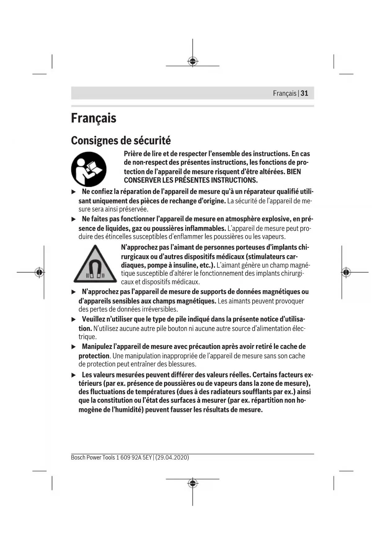 - %) – rouge: humidité trop élevée (>20%) Mémorisation des valeurs mesurées Pour mémoriser une valeur de mesure, actionnez brièvement la touche Marche/Arrêt/ Hold (1). La valeur de mesure mémorisée s’affiche sur la ligne inférieure (b) de l’écran (3). Toute nouvelle valeur de mesure s’affiche sur la ligne (a) de l’écran (3). Après mé- morisation de la nouvelle valeur de mesure sur la ligne inférieure de (b), la valeur de me- sure précédente s’affiche sur la ligne supérieure de (b), etc. Il est possible d’afficher au total deux valeurs de mesure (b) sur l’écran (3). Sur la ligne de chaque valeur mémorisée Bosch Power Tools 1 609 92A 5EY | (29.04.2020)38 | Français (b) apparaît en plus le groupe de bois sélectionné et une appréciation du taux d’humidi- té, sous forme de gouttes d’eau: – 1 goutte d’eau (correspond à LED de couleur verte): bois sec (humidité <12%) – 2 gouttes d’eau (correspond à LED de couleur orange): bois critique (humidité entre 12% %) – 3 gouttes d’eau (correspond à LED de couleur rouge): bois humide ( humidité >20%) Conseil: Cet affichage est très utile quand l’écran (3) n’est pas bien lisible sous un cer- tain angle ou pour effectuer des mesures comparatives. Lorsque vous éteignez l’appareil de mesure, les valeurs de mesure mémorisées sont effa- cées. Exemples d’application et valeurs indicatives de l’humidité du bois pour différentes constructions en bois Mesure de l’humidité du bois: – Bois de chauffage avant de le brûler: empêche la formation de fumées et réduit les émissions polluantes – Lames de parquet avant la pose: empêche l’apparition de fentes après la pose – Bois en ébénisterie: empêche l’apparition de moisissures, l’attaque par des insectes et la fissuration – Maisons en bois/cabanes de jardin: empêche l’apparition de moisissures et révèle les infiltrations d’eau – Roulottes en bois: peut aider à mettre en évidence des traces de moisissure ou de pourriture avant l’achat/la location Le tableau qui suit indique les taux d’humidité typiques pour différentes applications. Application Humidité du bois [%] Exemples Constructions fermées avec chauf- fage 9 ±3 p.ex. tables, chaises, mobilier dans cuisine/salle de séjour (en cas de chauffage en hiver) Constructions fermées sans chauf- fage 12 ±3 p.ex. étagères de cave (sans chauf- fage) Constructions ouvertes, recou- vertes 15 ±3 p.ex. abris de voitures 1 609 92A 5EY | (29.04.2020) Bosch Power ToolsFrançais | 39 Application Humidité du bois [%] Exemples Constructions exposées aux intem- péries 18 ±6 p.ex. murs extérieurs d’abris de jar- din ou cabanes Autres taux d’humidité de bois préconisés: – Construction d’une maison en bois: 18% maxi – Parquet: 9% ±2% – Planchers: 12% maxi – Faux planchers: 20% maxi – Sous-planchers: 15% maxi – Escaliers: 9% ±3% – Bois de chauffage: 22% maxi (idéal <17%) Fonction d’autotest La fonction d’autotest permet de contrôler le fonctionnement de l’appareil de mesure. Mettez l’appareil de mesure en marche(voir «Mise en marche/arrêt», Page36). Retirez le capuchon de protection (6). Maintenez les pointes (5) contre les contacts métalliques (12) au dos du capuchon de protection (6) (voir figure C). Comparez la valeur affichée sur l’écran avec la valeur imprimée sur le capuchon de pro- tection (6) pour le groupe de bois correspondant: – Groupe de bois A: 11,1%–11,9% – Groupe de bois B: 9,8%–10,4% Si les valeurs ne coïncident pas, faites parvenir l’appareil de mesure au service après- vente Bosch par l’intermédiaire de votre revendeur. Instructions d’utilisation Facteurs influant sur les résultats de mesure La précision de mesure est la meilleure quand l’objet en bois à mesurer se trouve à la température ambiante. Facteurs pouvant influer sur les résultats de mesure: – Groupe de bois et sous-groupe de bois – Température de l’objet en bois à mesurer – Séparation marquée entre duramen et aubier – Profondeur d’enfoncement des pointes dans le bois Bosch Power Tools 1 609 92A 5EY | (29.04.2020)40 | Français – Traitements de surface subis par le bois à mesurer (p.ex. huiles ou vernis) – Mesure parallèle ou perpendiculaire à la structure / au veinage du bois à mesurer – Répartition de l’humidité – Point de mesure (p.ex. au centre ou à l’extrémité du bout de bois) – État et structure du bois: doit être exempt de pourriture, nœuds et autres anomalies Attention: Si des valeurs exactes sont requises, effectuez une mesure selon la méthode gravimétrique (cf. DIN 52183). Défauts – Causes et remèdes Cause Remède Symbole d’avertissement (c), affichage de température (d) et« Err» sur l’écran La température ambiante n’est pas com- prise entre –5 °C et +50 °C. Attendez que l’appareil de mesure se trouve à nouveau dans la plage de tempéra- tures admissibles. Pour groupe de bois A: >74,7% et« HI» sur l’écran Pour groupe de bois B: >61,9% et« HI» sur l’écran Taux d’humidité du bois en dehors de la plage de mesure (trop élevé) Répétez la mesure à un autre endroit. Affichage« – –.–» sur l’écran Taux d’humidité du bois en dehors de la plage de mesure (trop faible) ou mesure pas effectuée correctement Répétez la mesure à un autre endroit. L’appareil de mesure surveille son bon fonctionnement à chaque mesure. Au cas où un défaut est détecté,« Err» et le symbole d’avertissement (c) s’affichent sur l’écran. Étei- gnez et remettez en marche l’appareil de mesure. Si le problème persiste, retirez puis ré- insérez les piles et redémarrez l’appareil de mesure après quelques secondes. Si les me- sures citées n’apportent aucune amélioration, faites parvenir l’appareil de mesure au ser- vice après-vente Bosch par l’intermédiaire de votre revendeur. Entretien et Service après‑vent