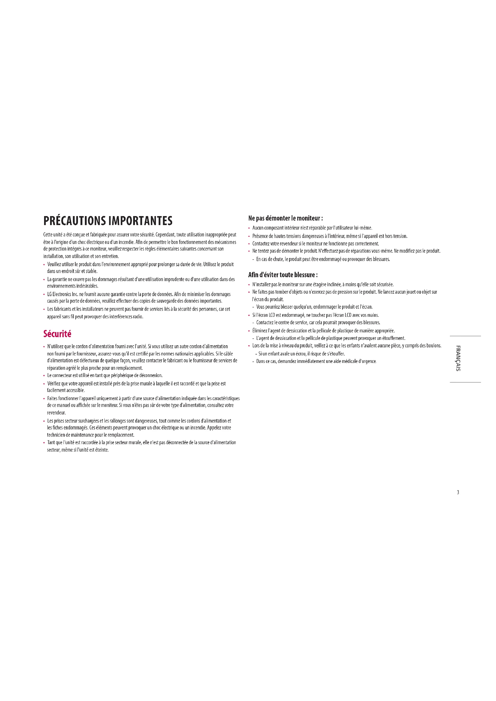 Cette unité a été conçue et fabriquée pour assurer votre sécurité. Cependant, toute utilisation inappropriée peut être à l'origine d'un choc électrique ou d'un incendie. Afin de permettre le bon fonctionnement des mécanismes de protection intégrés à ce moniteur, veuillez respecter les règles élémentaires suivantes concernant son installation, son utilisation et son entretien.