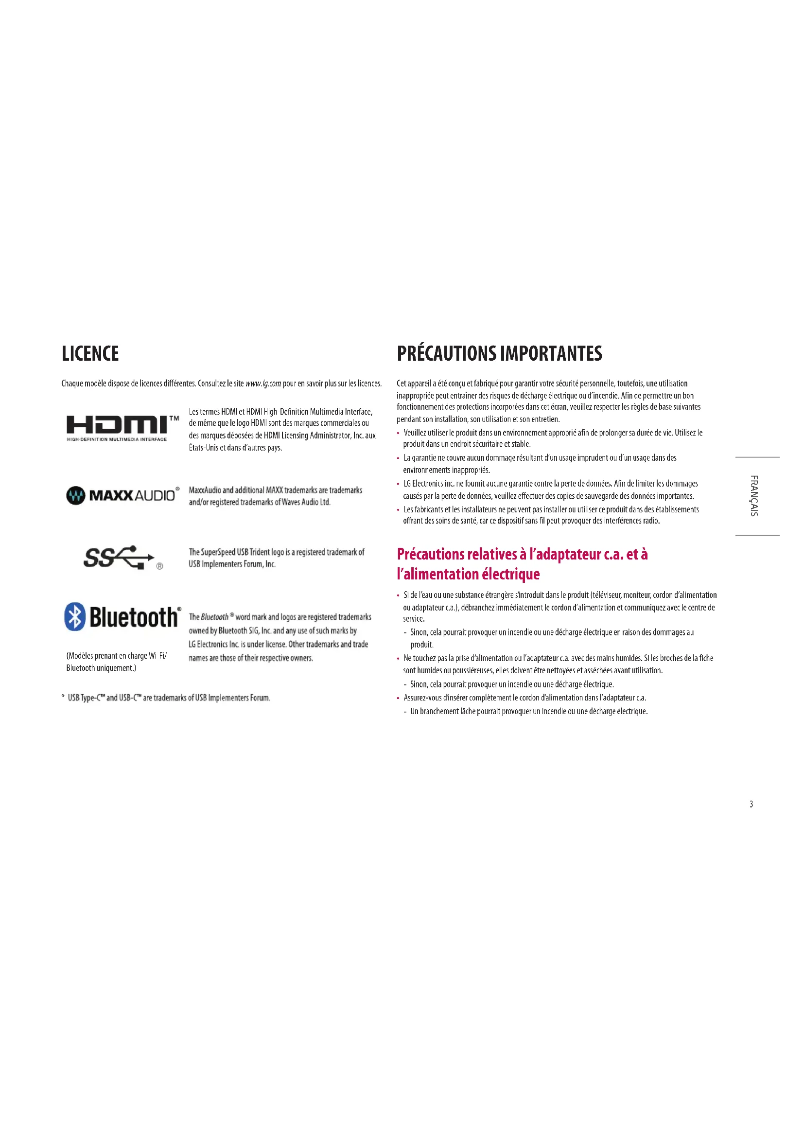 FRANÇAIS LICENCE Chaque modèle dispose de licences différentes. Consultez le site www.lg.com pour en savoir plus sur les licences. Les termes HDMI et HDMI High-Definition Multimedia Interface, de même que le logo HDMI sont des marques commerciales ou des marques déposées de HDMI Licensing Administrator, Inc. aux États-Unis et dans d’autres pays.