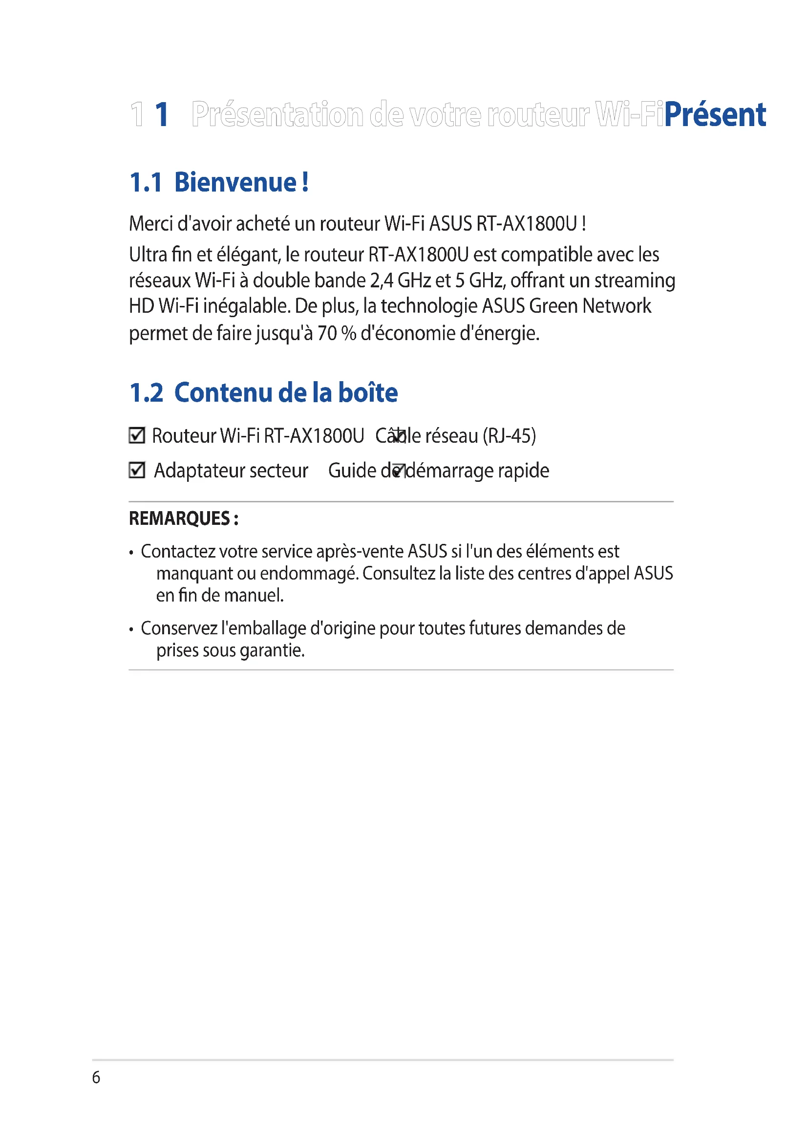 Routeur Wi-Fi RT-AX1800U Câble réseau (RJ-45) Adaptateur secteur Guide de démarrage rapide REMARQUES :
