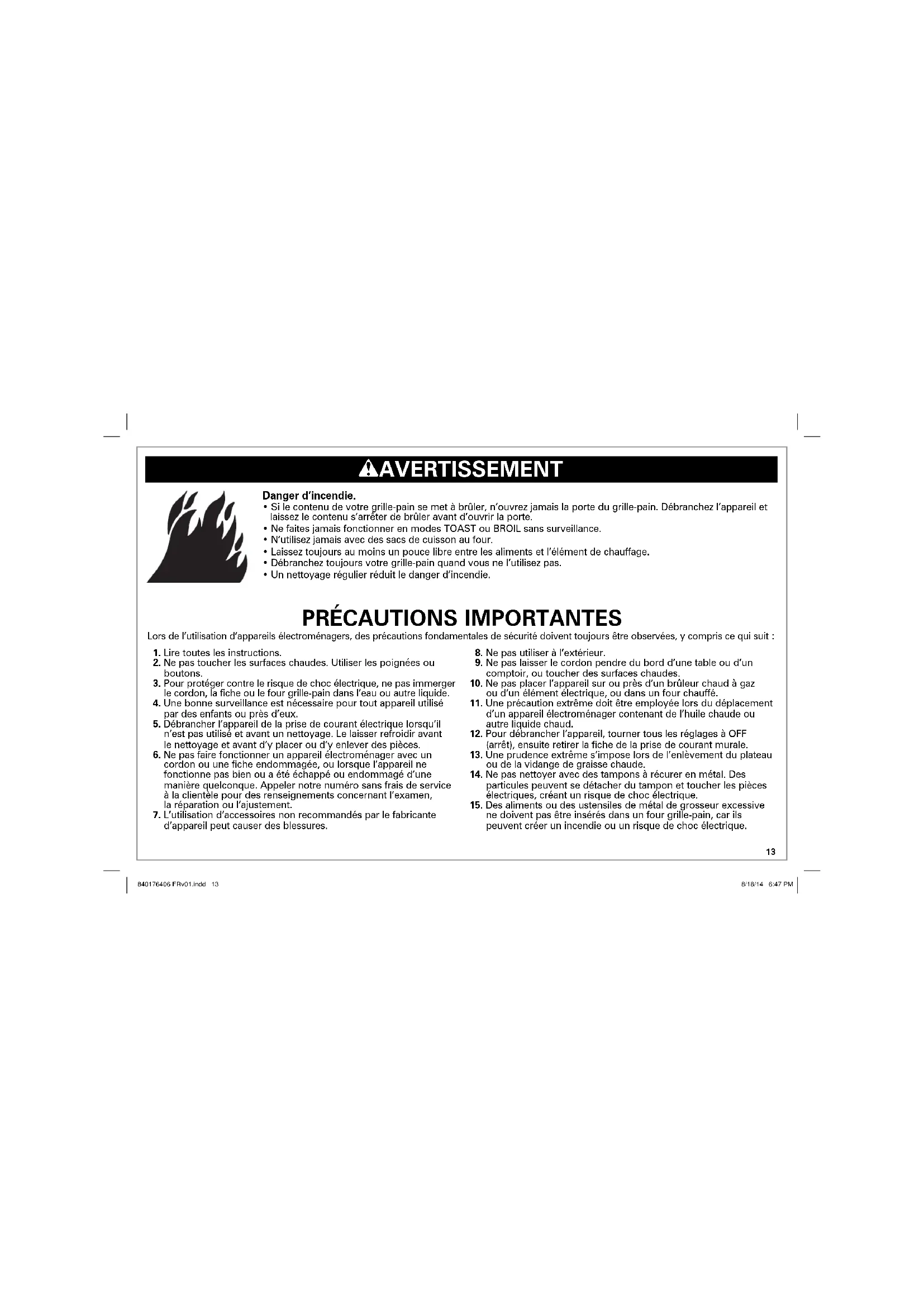 - Un nettoyage régulier réduit le danger d’incendie. 840176406 FRv01.indd 13840176406 FRv01.indd 13 8/18/14 6:47 PM8/18/14 6:47 PM14 CONSERVER CES INSTRUCTIONS !