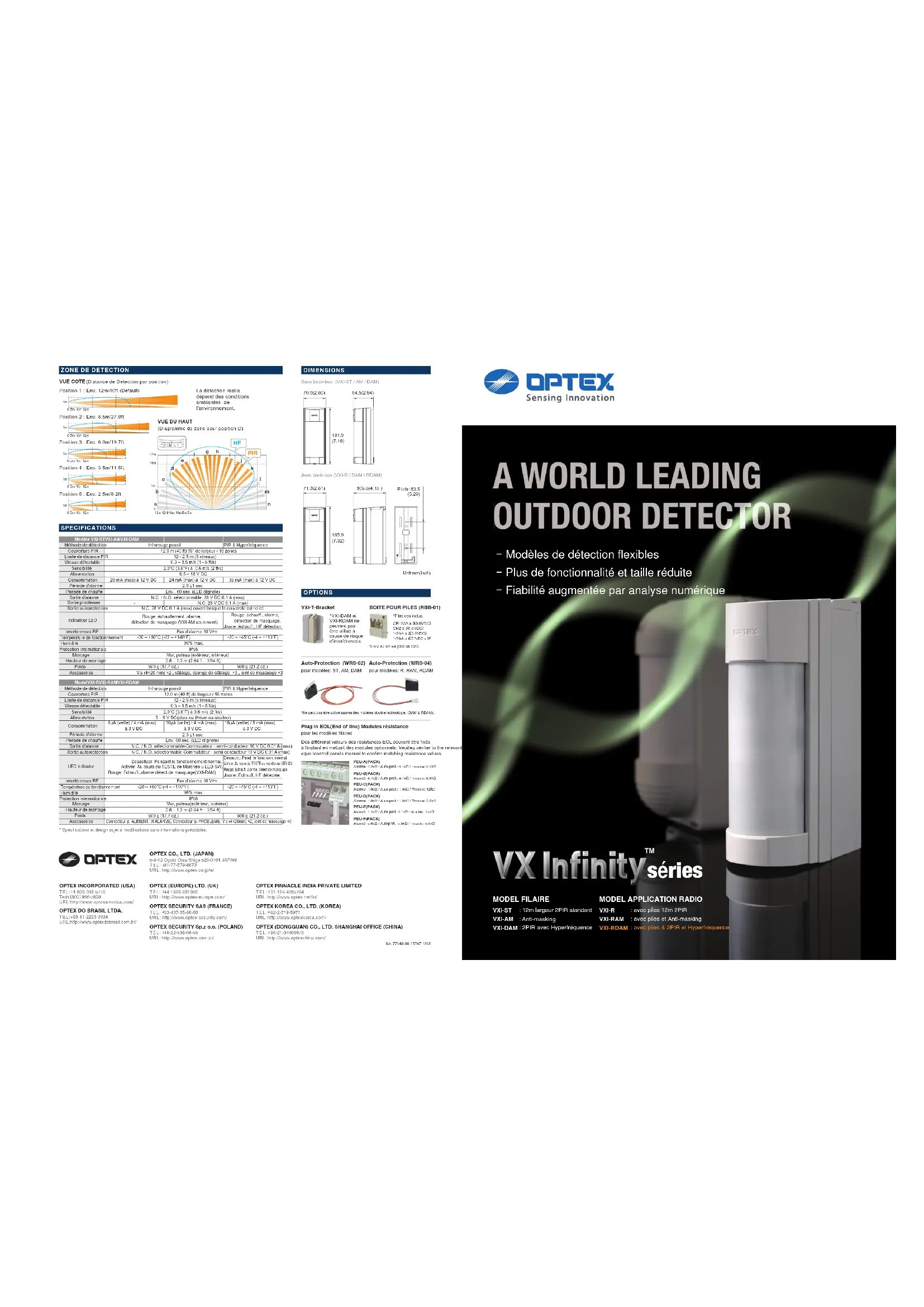 (pour modèles DAM et RDAM) Pas de détectionDétection etc. Pas de détectionAll VXI models are equipped with a digitally enhanced signal recognition logic called SMDA. SMDA improves immunity against various noise factors such as climate changes and vegetation sways. VXIs expands applicable fields and reliability beyond what VX-402 was capable. Logique SMDA (Super Multidimensional Analysis) Pas d'alarme si un faisceaux est coupé.VXI-ST (modèle filaire)VXI-R (modèle avec piles)mm (inch)8 Positions de zonehorizontale5 Niveaux de réglage distance de détectionOPTEX Tough Mod Technologie permet uneviabilité à longue durée de la double-technologie. Le Tough Mod en plaqué augmente la durabilitéd'un détecteur de résister à des climats chaudset humids. Maintenant, Tough Mod 2étend la capacité de doubledétection de détecteurs à piles avec des circuits d'économie d'énergie.L'installation du VXI est devenue plus facile et polyvalente avec la nouvelle plaque de montage.Fixer la sur un mur et faites le montage du VXI. Vous pouvez également utiliser une bande métallique avec moins de 25mm de largeur pour fixer le VXI sur n'importe quel diamèetre de poteau. Modules Auto-Protection sont applicables. Plaque de montage polyvalente ImagesPCB boardMatérielCeramique Plaqué orMatérielAntenneVX Infinity series ComventionalTrigger-Radio - Références* Durée de vie e VXI CR123(3VDC 1300mAh) 6ans 4ans 4ans 2ans CR2 (3VDC 750mAh)R, RAM Env. RDAM Env. Env. Env.Un émetteur sans fil de votre choix peut êtrelogé dans les modèles VXI-R/RAM/RDAM. Ces modèles consomment un courant éléctrique*à partir d'un minimum de batterie. Une boite de batterie (RBB-01) peut étendre la capacité de batterie pour prolonger la période d'exploitation.Module de résistance EOL(End of line) factultatif est disponible.IP55 UV résistant ASA boitier *Référence approximative basée sur un état hypothétique avec les réglages: LED(OFF), AM(ON), Battery Saving Timer(120sec) *A partir de 9 micro ampérage au veille. Protection boitier Protection Anti- UV IP55 Tous les modèles de VXI comprennent un boitier arrière. Il est conçu pour recevoirdes différents émetteurs radio ou peut être utilisé comme un conduit ou une entretoiseentre une paroi et le détecteur. L'utilisation du boitier arrièere set facultativepour les installations filaires. Back Box spacieux et multifonctionnel Tough Mod.2