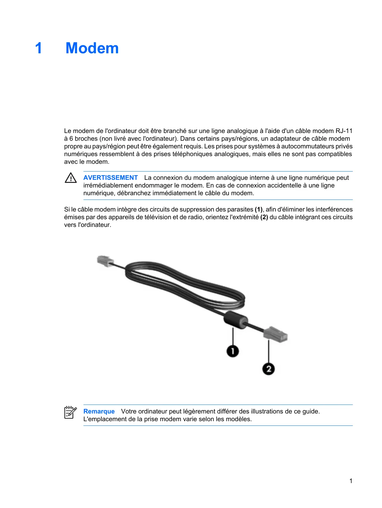 Modem Le modem de l'ordinateur doit être branché sur une ligne analogique à l'aide d'un câble modem RJ-11 à 6 broches (non livré avec l'ordinateur). Dans certains pays/régions, un adaptateur de câble modem propre au pays/région peut être également requis. Les prises pour systèmes à autocommutateurs privés numériques ressemblent à des prises téléphoniques analogiques, mais elles ne sont pas compatibles avec le modem. AVERTISSEMENT La connexion du modem analogique interne à une ligne numérique peut irrémédiablement endommager le modem. En cas de connexion accidentelle à une ligne numérique, débranchez immédiatement le câble du modem. Si le câble modem intègre des circuits de suppression des parasites (1), afin d'éliminer les interférences émises par des appareils de télévision et de radio, orientez l'extrémité (2) du câble intégrant ces circuits vers l'ordinateur. Remarque Votre ordinateur peut légèrement différer des illustrations de ce guide. L'emplacement de la prise modem varie selon les modèles. FRWW