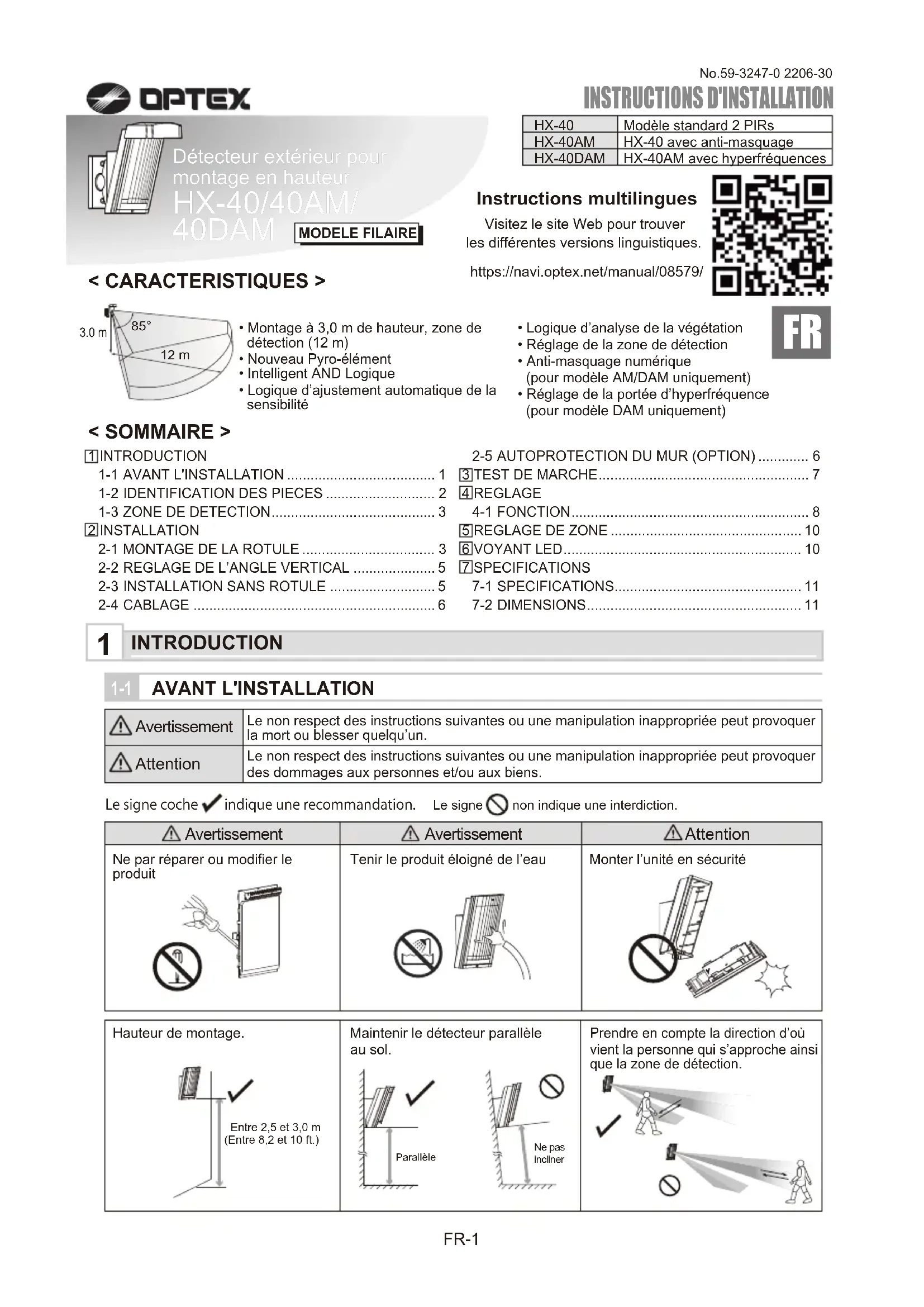 Instructions multilinguesVisitez le site Web pour trouver les différentes versions linguistiques. https://navi.optex.net/manual/08579/ FR-1 12 m 85° No.59-3247-0 2206-303.0 m