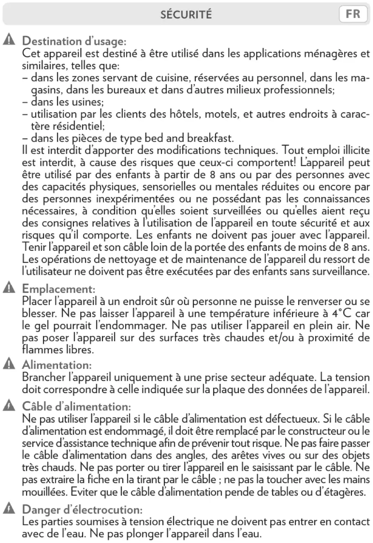 gement, à un mauvais emploi, au non-respect des instructions d’utilisation, à une installation inadéquate, à des réparations réalisées par des personnes non autorisées, à l’utilisation d’accessoires et de pièces ina- daptés, à l’usure normale de l’appareil (dépôts de calcaire, usure des joints ou du filtre à eau), à la foudre, à l’humidité, au feu, au choix d’un voltage incorrect ou à tout autre événement ne pouvant être attribué au fabricant ou à des défauts de fabrication de l’appareil.