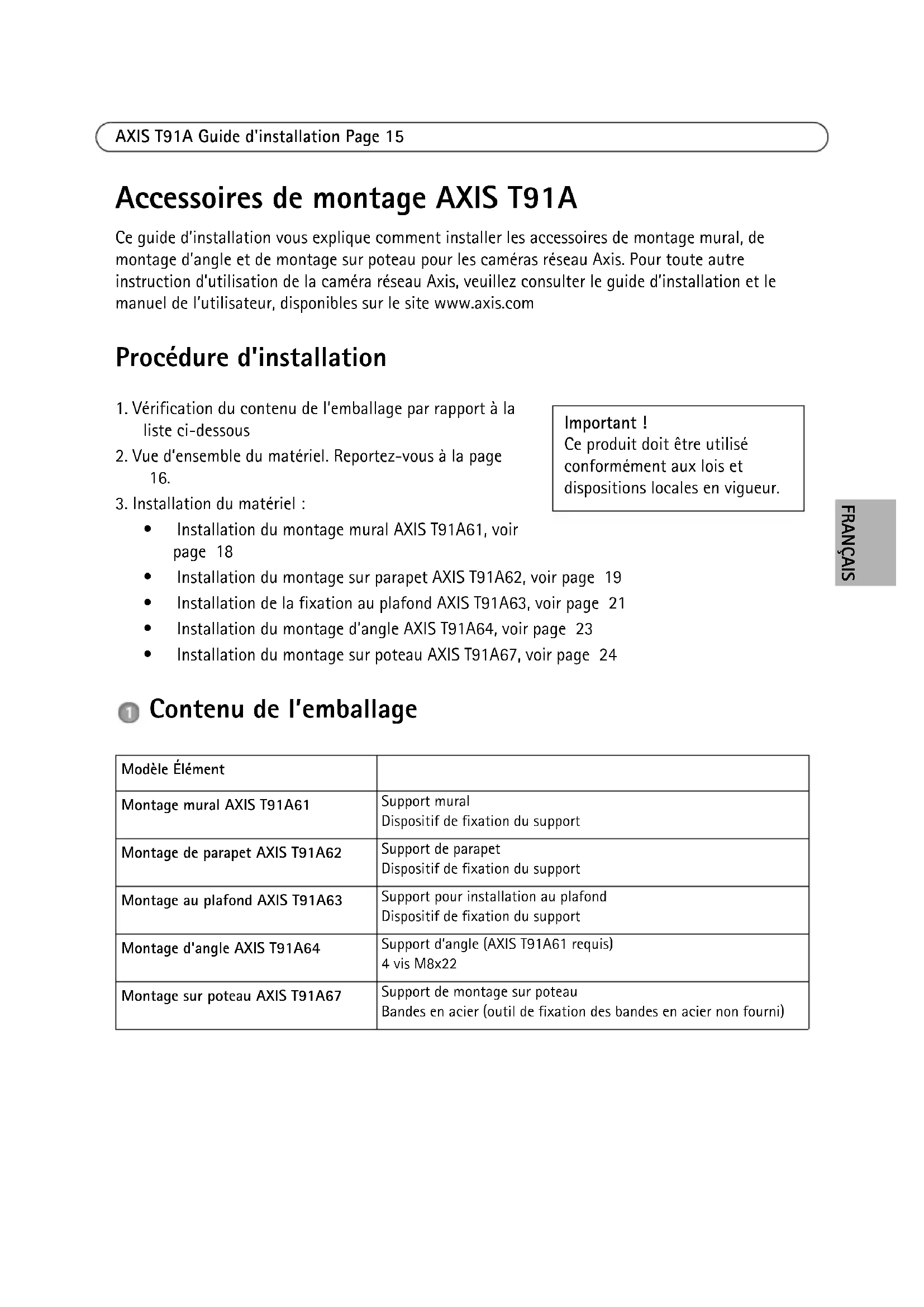 Installation du montage sur poteau AXIS T91A67, voir page 24 Contenu de l’emballage Modèle Élément Montage mural AXIS T91A61 Support mural Dispositif de fixation du support Montage de parapet AXIS T91A62 Support de parapet Dispositif de fixation du support Montage au plafond AXIS T91A63 Support pour installation au plafond Dispositif de fixation du support Montage d'angle AXIS T91A64 Support d’angle (AXIS T91A61 requis) 4 vis M8x22 Montage sur poteau AXIS T91A67 Support de montage sur poteau Bandes en acier (outil de fixation des bandes en acier non fourni) Important ! Ce produit doit être utilisé conformément aux lois et dispositions locales en vigueur. cam_IG.book Page 15 Friday, December 18, 2009 3:14 PMPage 16 AXIS T91A Guide d'installation Description du matériel Couvercle latéral (retirer pour passer le câble) Vis Torx T30 (4) Adaptateur de suspension Support de parapet Couvercle latéral Écrou de sécurité Vis Torx T30 (4) Adaptateur de suspension (retirer pour passer le câble) Support pour installation au plafond Couvercle latéral (retirer pour Torx T30 Adaptateur de suspension vis (4) passer le câble) cam_IG.book Page 16 Friday, December 18, 2009 3:14 PMAXIS T91A Guide d'installation Page 17 FRAN