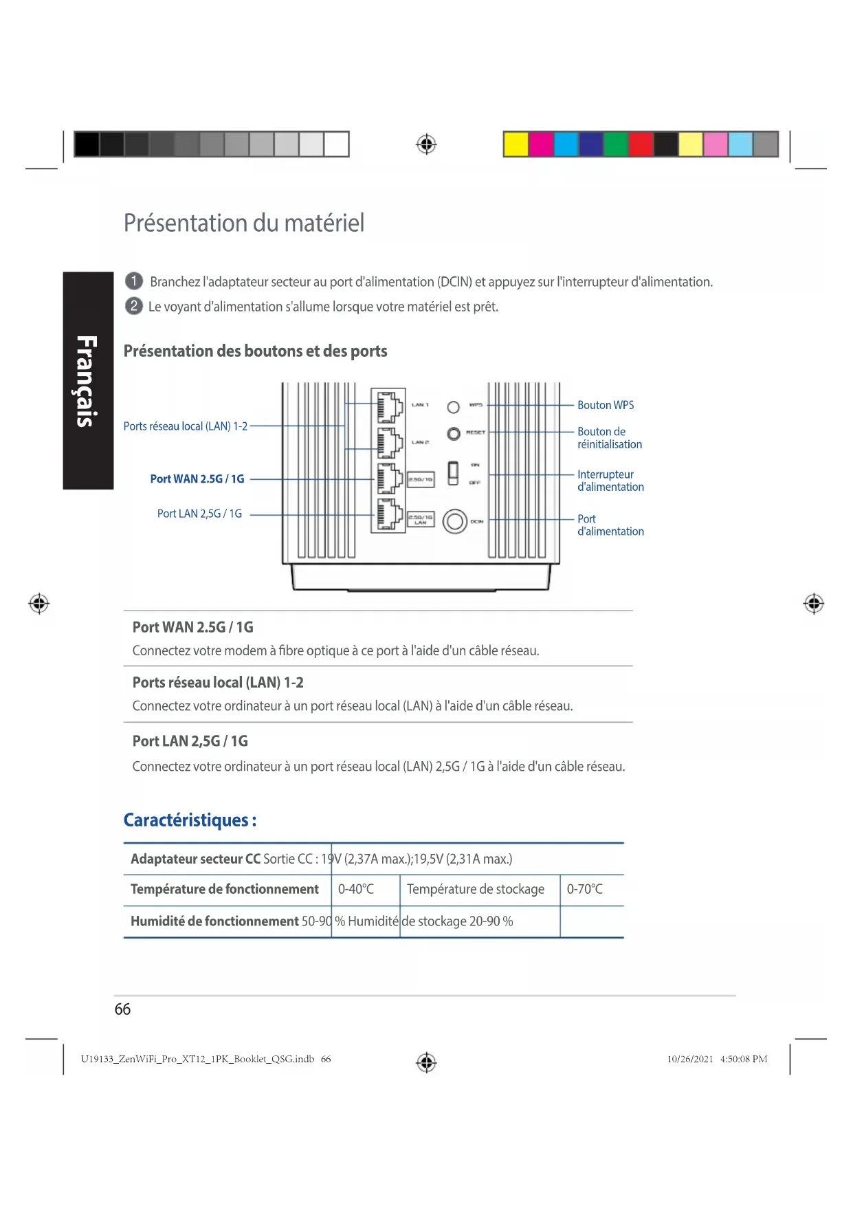 Le voyant d'alimentation s'allume lorsque votre matériel est prêt. Présentation des boutons et des ports Port WAN 2.5G / 1G Connectez votre modem à bre optique à ce port à l'aide d'un câble réseau. Ports réseau local (LAN) 1-2 Connectez votre ordinateur à un port réseau local (LAN) à l'aide d'un câble réseau.Adaptateur secteur CC Sortie CC : 19V (2,37A max.);19,5V (2,31A max.) Température de fonctionnement 0-40°C Température de stockage 0-70°C Humidité de fonctionnement 50-90 % Humidité de stockage 20-90 % Caractéristiques : Ports réseau local (LAN) 1-2Bouton WPSBouton de réinitialisationInterrupteur d'alimentationPort d'alimentation Port LAN 2,5G / 1G Connectez votre ordinateur à un port réseau local (LAN) 2,5G / 1G à l'aide d'un câble réseau.Port WAN 2.5G / 1GPort LAN 2,5G / 1G U19133_ZenWiFi_Pro_XT12_1PK_Booklet_QSG.indb 66U19133_ZenWiFi_Pro_XT12_1PK_Booklet_QSG.indb 66 10/26/2021 4:50:08 PM10/26/2021 4:50:08 PM67 Français Avant l'installation Congurer un routeur autonome