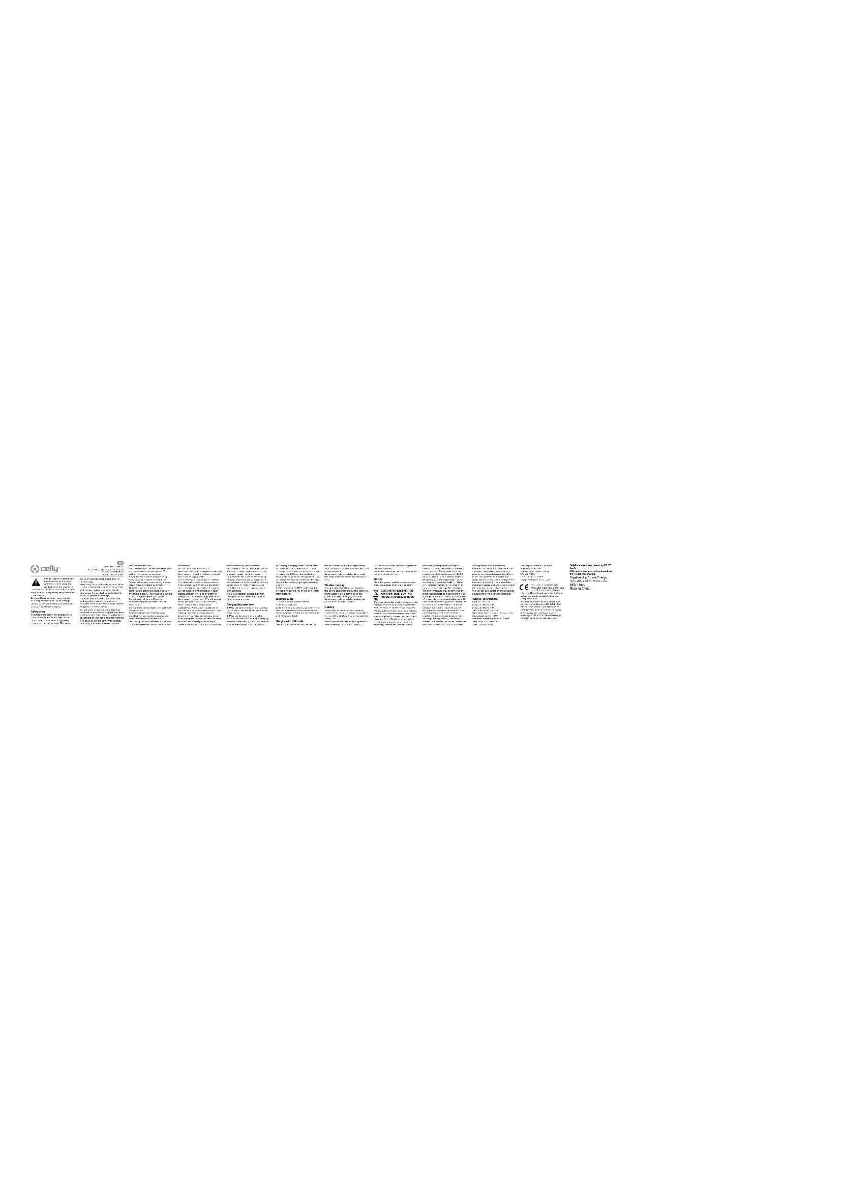 vous que les caractéristiques techniques de votre appareil (tension, ampérage) sont compatibles avec la batterie externe. Chargement avec câble USB Connectez l'appareil au port USB du powerbank à l'aide du câble d'origine fourni avec votre appareil. Le chargement de l'appareil commencera. Une fois la charge terminée, débranchez le câble de l'appareil et de la banque d'alimentation. Chargement sans fil Alignez magnétiquement la banque d'alimentation sur le téléphone et appuyez sur le bouton bouton de démarrage de la charge sur le côté droit du produit, la charge sans fil commencera. Une fois la charge terminée, débranchez la batterie externe du téléphone. Nettoyage Débranchez tous les câbles avant le nettoyage. Si nécessaire, nettoyez la batterie externe avec un chiffon humide et laissez-la sécher complètement avant utilisation. Utilisez une brosse propre à poils longs et doux pour enlever la poussière des connecteurs. N'utilisez pas de solvants, d'agents corrosifs ou de nettoyants gazeux. Assurez-vous que l'eau ou d'autres liquides ne pénètrent pas dans le boîtier. espace de rangement Rangez la banque d'alimentation dans un endroit propre et sec. Tenir à l'abri de la lumière directe du soleil. Informations destinées à l'utilisateur pour éliminer correctement l'appareil (Directive 2013/56/EU) Le symbole de la poubelle barrée figurant sur l'équipement ou sur son emballage indique que le produit en fin de vie utile, y compris la batterie non amovible, doit être collecté séparément des autres déchets pour permettre un traitement et un recyclage appropriés. L'utilisation en toute sécurité de ce produit est garantie dans le respect des instructions suivantes, il est donc nécessaire de les conserver et de les suivre scrupuleusement pendant toute la durée de vie du produit. Le produit ne nécessite pas d'entretien technique, NE LE DÉMONTER JAMAIS. La batterie à l'intérieur est intégrée et non remplaçable. N'essayez pas de retirer vous-même la batterie lithium-ion/ polymère intégrée car cela pourrait provoquer une surchauffe, un incendie et des blessures. La batterie ne doit être retirée que par des professionnels qualifiés indépendants qui sont en mesure de la retirer en toute sécurité et de la mettre au rebut conformément aux lois applicables. L'utilisateur doit donc remettre gratuitement l'équipement en fin de vie aux centres municipaux compétents pour la collecte séparée des déchets électriques et électroniques, ou le retourner au revendeur, un par un, ou gratuit pour les appareils de dimensions extérieures inférieures jusqu'à 25 cm. Une collecte séparée adéquate pour l'expédition ultérieure des équipements déclassés pour recyclage, traitement et élimination respectueuse de l'environnement permet d'éviter d'éventuels effets négatifs sur l'environnement et la santé et favorise la réutilisation et/ou le recyclage des matériaux dont il est composé l'équipement. L'élimination illégale des équipements, piles et accumulateurs par l'utilisateur entraîne l'application des sanctions prévues par la législation en vigueur. Spécifications techniques Entrée : CC 5 V/2 A Sortie 1 : CC 5 V/2 A Sortie 2 : CC 5 V/2 A Sortie totale: DC 5V/2A Sortie sans fil : CC 5 V/1 A, 9 V/1,1 A Puissance de sortie maximale : 10 W Puissance rayonnée maximale : <20 mW Fréquence : 110-205 KHz Temps de charge : 3 heures Capacité : 5000mAh / 18.5Wh Logiciel : SW6201 Type de batterie : batterie Li-ion Poids : 135g Taille: 96*63*12mm Température d'utilisation : 0 - 40 ° Ce produit est conforme à RoHS 2011/65/EU-2015/863/EU. Le produit est marqué CE et est conforme aux normes de sécurité établies par l'Union européenne. Esprinet SpA déclare que le produit est conforme à la directive 2014/53/UE. Le texte intégral de la déclaration de conformité UE est disponible à l'adresse Internet suivante : www.celly.com/ exchange/CELLY-SPA/Dichiarazioni_di_ conformita/MAGPB5000/DOC.pdf Celly® est une marque enregistrée appartenant à CELLY S.p.A. Toutes les marques enregistrées appartiennent à leurs propriétaires respectifs. Esprinet S.p.A., via Energy Park 20, 20871 Vimercate (MB) - Italie Made in Chine. Manuel d'instructions