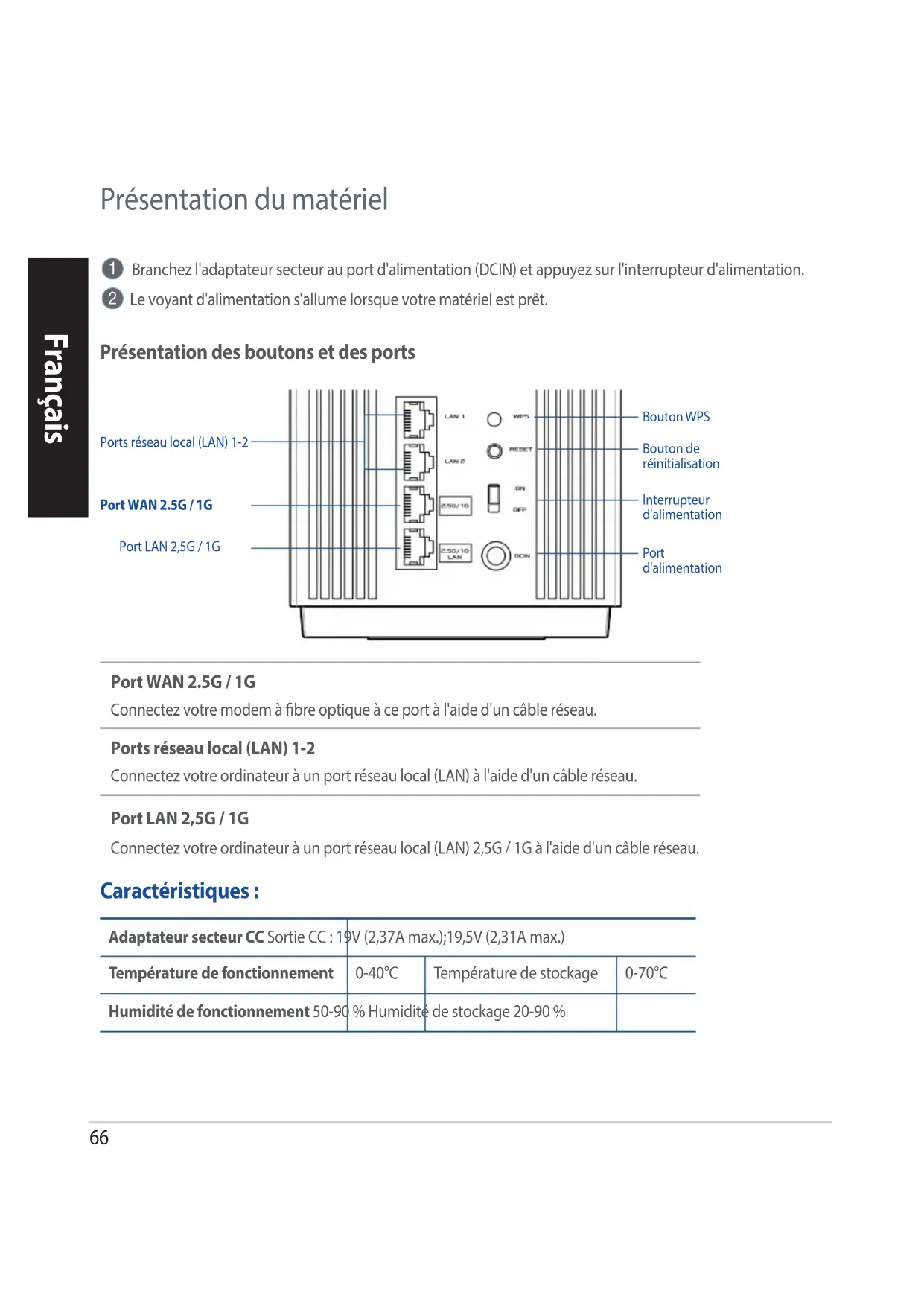 Le voyant d'alimentation s'allume lorsque votre matériel est prêt. Présentation des boutons et des ports Port WAN 2.5G / 1G Connectez votre modem à bre optique à ce port à l'aide d'un câble réseau. Ports réseau local (LAN) 1-2 Connectez votre ordinateur à un port réseau local (LAN) à l'aide d'un câble réseau.Adaptateur secteur CC Sortie CC : 19V (2,37A max.);19,5V (2,31A max.) Température de fonctionnement 0-40°C Température de stockage 0-70°C Humidité de fonctionnement 50-90 % Humidité de stockage 20-90 % Caractéristiques : Ports réseau local (LAN) 1-2Bouton WPSBouton de réinitialisationInterrupteur d'alimentationPort d'alimentation Port LAN 2,5G / 1G Connectez votre ordinateur à un port réseau local (LAN) 2,5G / 1G à l'aide d'un câble réseau.Port WAN 2.5G / 1GPort LAN 2,5G / 1G67 Français Avant l'installation Congurer un routeur autonome