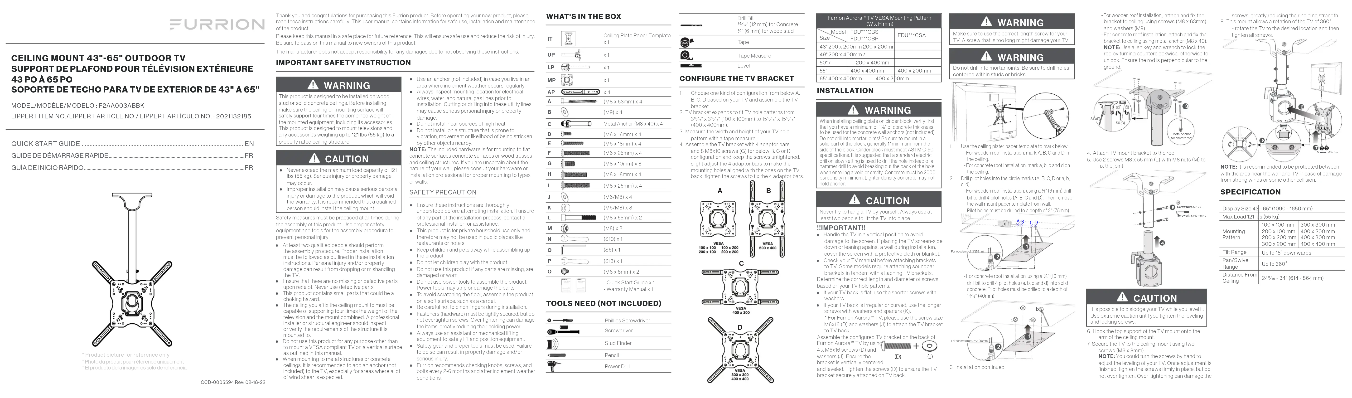 Quic k S tart Gu ide- Guide dedémarrage rapide x1- Manuel degarantie x1 OUTILS NÉCESSAIRES (NON INCLUS) Tournevis PhillipsTournevisDétecteur degoujonsCrayonPerceuse électrique AVERTISSEMENT Ce produit est conçu pour être installé sur des plafonds àmontants enbois ouenbéton massif. Avant l’installation, assurez-vous que leplafond oulasurface demontage peut supporter entoute sécurité quatre fois lepoids combiné del’équipement monté, ycompris ses accessoires. Ceproduit est conçu pour monter des téléviseurs ettous les accessoires pesant jusqu’à 121lb(55kg) sur une structure deplafond correctement classée.