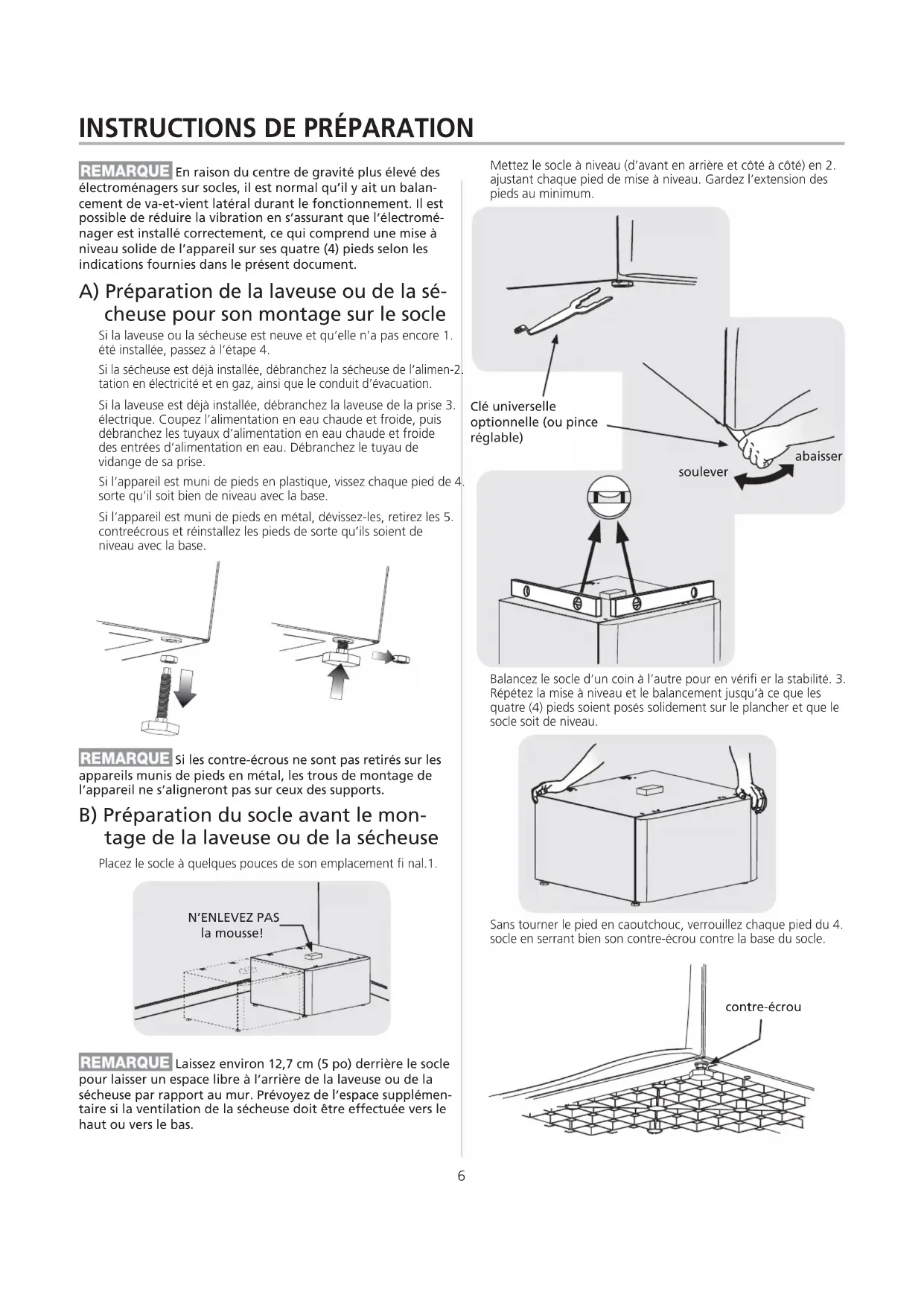 Laissez environ 12,7 cm (5 po) derrière le socle pour laisser un espace libre à l’arrière de la laveuse ou de la sécheuse par rapport au mur. Prévoyez de l’espace supplémen- taire si la ventilation de la sécheuse doit être effectuée vers le haut ou vers le bas. Si les contre-écrous ne sont pas retirés sur les appareils munis de pieds en métal, les trous de montage de l’appareil ne s’aligneront pas sur ceux des supports. En raison du centre de gravité plus élevé des électroménagers sur socles, il est normal qu’il y ait un balan- cement de va-et-vient latéral durant le fonctionnement. Il est possible de réduire la vibration en s’assurant que l’électromé- nager est installé correctement, ce qui comprend une mise à niveau solide de l’appareil sur ses quatre (4) pieds selon les indications fournies dans le présent document. Si la laveuse ou la sécheuse est neuve et qu’elle n’a pas encore 1. été installée, passez à l’étape 4. Si la sécheuse est déjà installée, débranchez la sécheuse de l’alimen-2. tation en électricité et en gaz, ainsi que le conduit d’évacuation. Si la laveuse est déjà installée, débranchez la laveuse de la prise 3. électrique. Coupez l’alimentation en eau chaude et froide, puis débranchez les tuyaux d’alimentation en eau chaude et froide des entrées d’alimentation en eau. Débranchez le tuyau de vidange de sa prise. Si l’appareil est muni de pieds en plastique, vissez chaque pied de 4. sorte qu’il soit bien de niveau avec la base. Si l’appareil est muni de pieds en métal, dévissez-les, retirez les 5. contreécrous et réinstallez les pieds de sorte qu’ils soient de niveau avec la base. A) Préparation de la laveuse ou de la sé- cheuse pour son montage sur le socle B) Préparation du socle avant le mon- tage de la laveuse ou de la sécheuse Placez le socle à quelques pouces de son emplacement fi nal.1. Mettez le socle à niveau (d’avant en arrière et côté à côté) en 2. ajustant chaque pied de mise à niveau. Gardez l’extension des pieds au minimum. Balancez le socle d’un coin à l’autre pour en vérifi er la stabilité. 3. Répétez la mise à niveau et le balancement jusqu’à ce que les quatre (4) pieds soient posés solidement sur le plancher et que le socle soit de niveau. Sans tourner le pied en caoutchouc, verrouillez chaque pied du 4. socle en serrant bien son contre-écrou contre la base du socle.