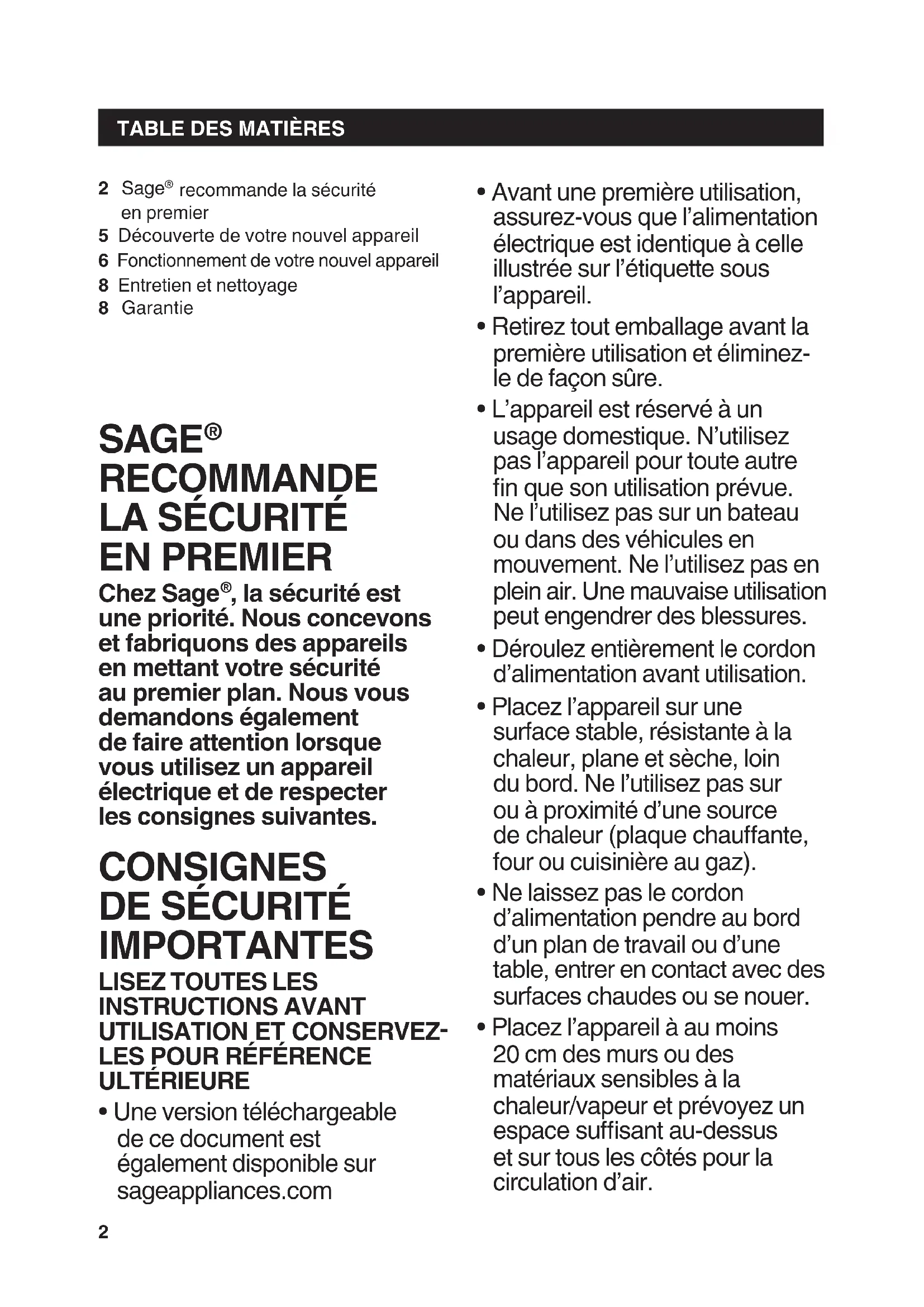 - Une version téléchargeable de ce document est également disponible sur sageappliances.com 2 Sage
