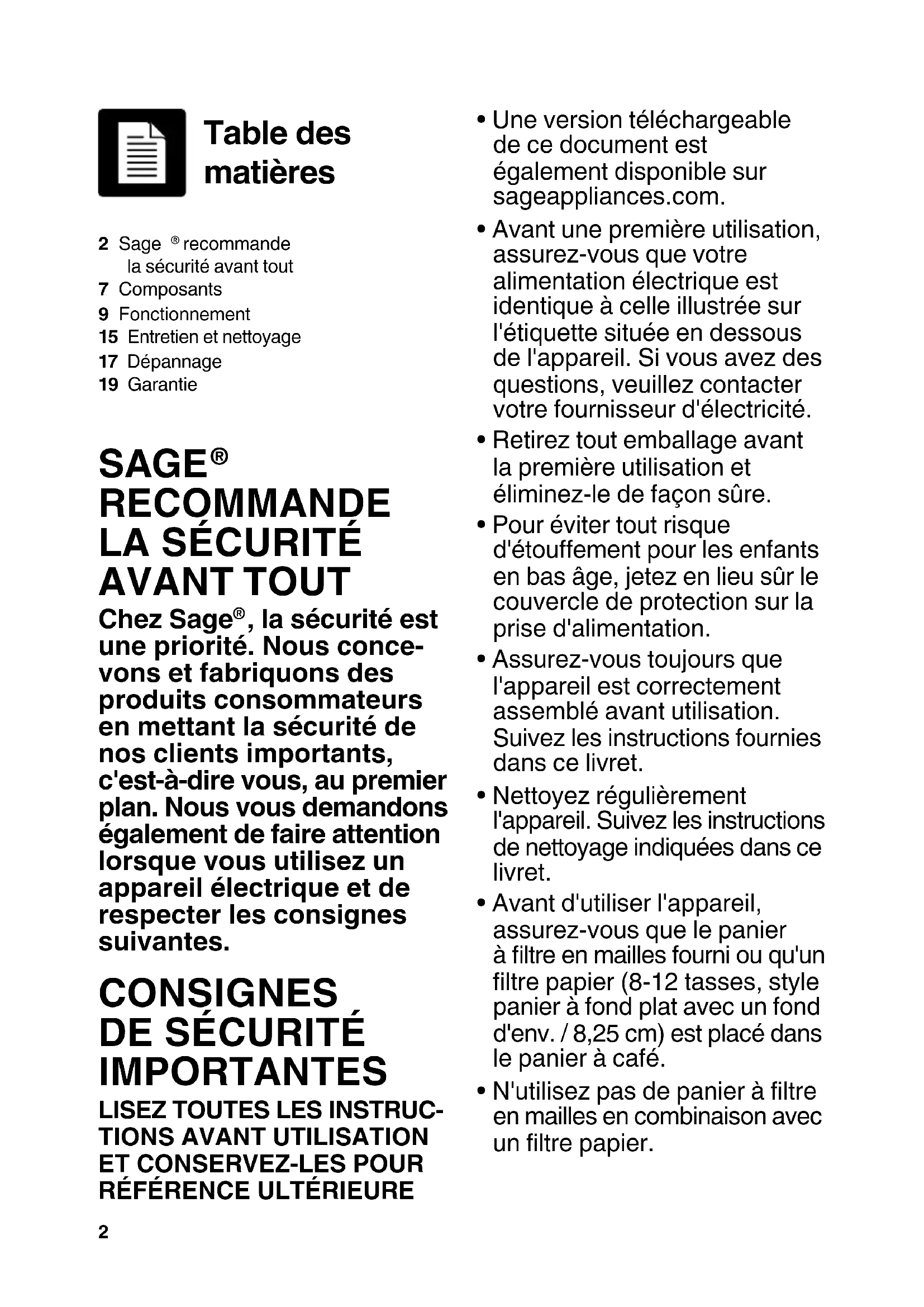 - N'utilisez pas de panier à ltre en mailles en combinaison avec un ltre papier. 2 Sage recommande la sécurité avant tout7 Composants9 Fonctionnement15 Entretien et nettoyage17 Dépannage19 Garantie Table des matières3
