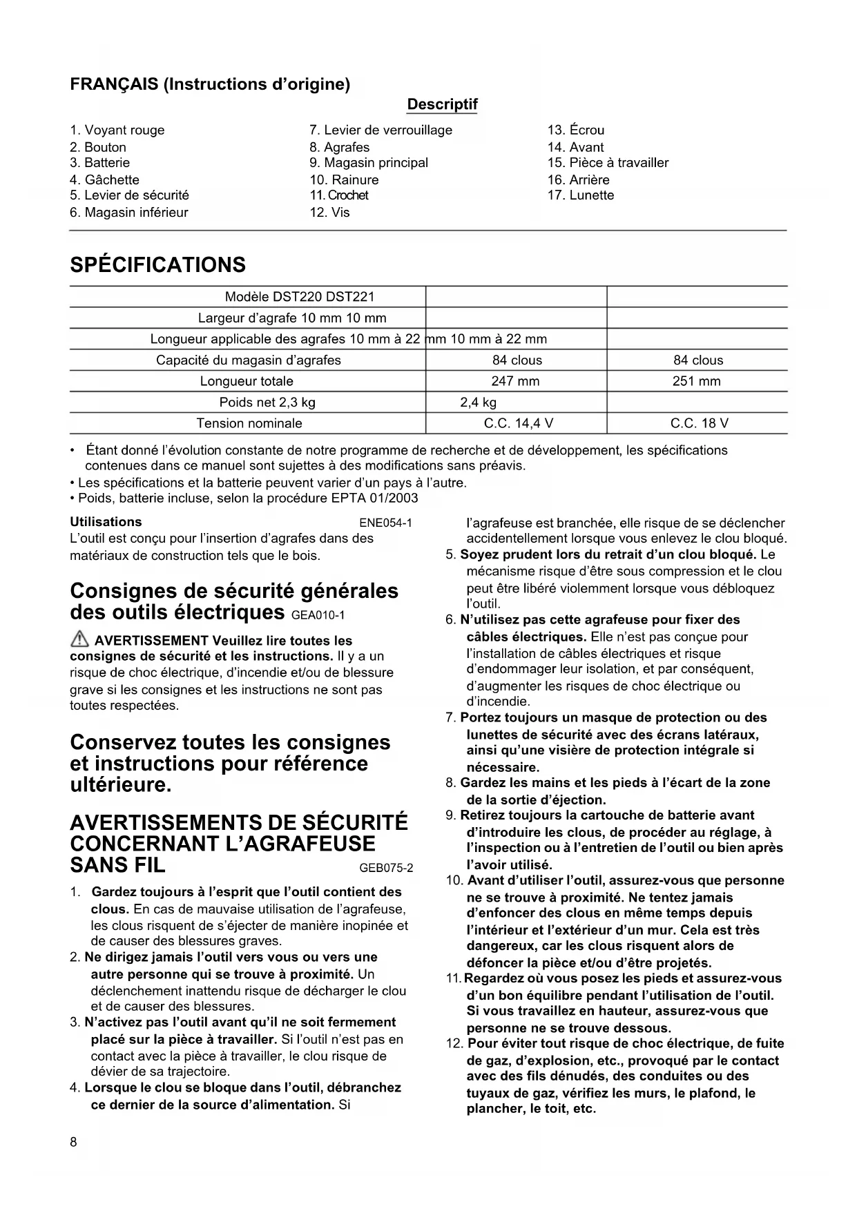 - Poids, batterie incluse, selon la procédure EPTA 01/2003 Utilisations ENE054-1 L’outil est conçu pour l’insertion d’agrafes dans des matériaux de construction tels que le bois. Consignes de sécurité générales des outils électriques GEA010-1 AVERTISSEMENT Veuillez lire toutes les consignes de sécurité et les instructions. Il y a un risque de choc électrique, d’incendie et/ou de blessure grave si les consignes et les instructions ne sont pas toutes respectées. Conservez toutes les consignes et instructions pour référence ultérieure.