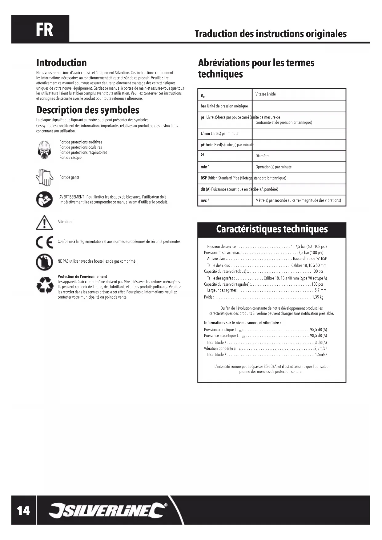 ⁄4"BSP Taille des clous : ..................................Calibre18,10à50mm Capacité du réservoir (clous) :.....................................100 pcs Taille des agrafes : ................Calibre18,13à40mm(type90ettypeA) Capacité du réservoir (agrafes) :...................................100 pcs Largeur des agrafes : ............................................5,7 mm Poids : ........................................................1,35 kg Dufaitdel’évolutionconstantedenotredéveloppementproduit,les caractéristiquesdesproduitsSilverlinepeuventchangersansnoticationpréalable. Informations sur le niveau sonore et vibratoire : Pression acoustique L :.......................................95,5 dB (A) Puissance acoustique L : . . . . . . . . . . . . . . . . . . . . . . . . . . . . . . . . . . . . . 98,5 dB (A) Incertitude K: ..................................................3 dB (A) Vibration pondérée a :...........................................2,5m/s