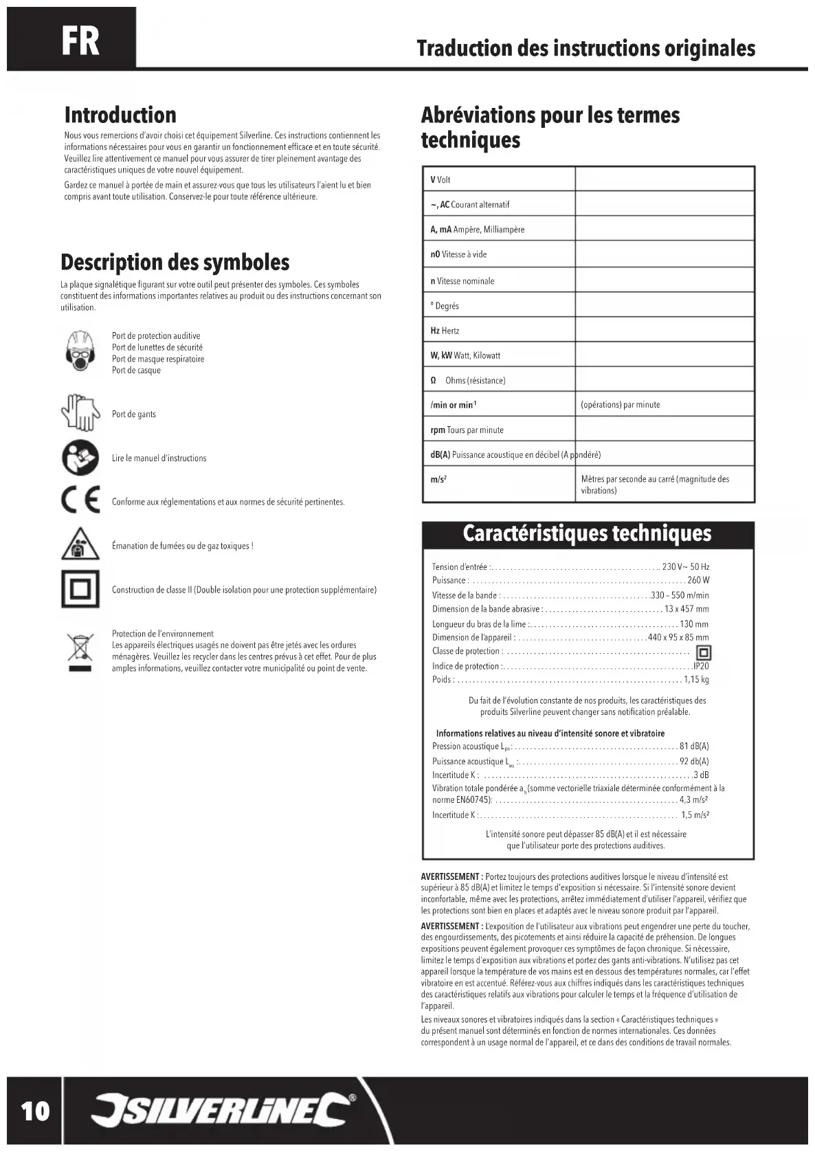 Mètres par seconde au carré (magnitude des vibrations) Introduction Nousvousremercionsd’avoirchoisicetéquipementSilverline.Cesinstructionscontiennentlesinformationsnécessairespourvousengarantirunfonctionnementefcaceetentoutesécurité.Veuillez lire attentivement ce manuel pour vous assurer de tirer pleinement avantage des caractéristiques uniques de votre nouvel équipement. Gardezcemanuelàportéedemainetassurez-vousquetouslesutilisateursl’aientluetbiencompris avant toute utilisation. Conservez-le pour toute référence ultérieure. Traduction des instructions originales