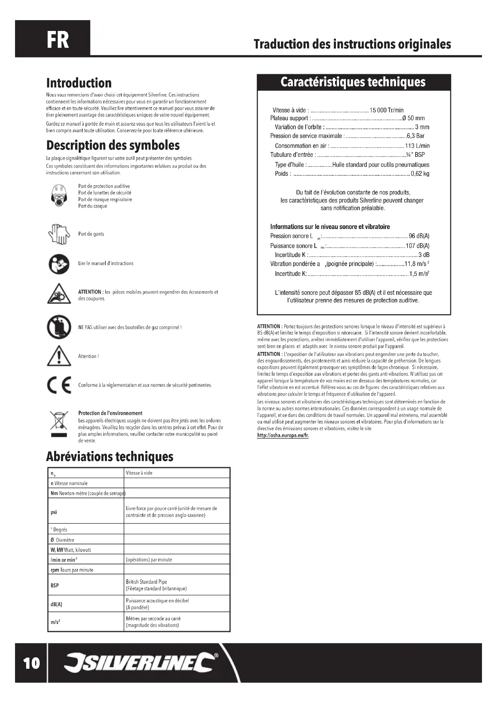 Nous vous remercions d'avoir choisi cet équipement Silverline. Ces instructions contiennent les informations nécessaires pour vous en garantir un fonctionnement efficace et en toute sécurité. Veuillez lire attentivement ce manuel pour vous assurer de tirer pleinement avantage des caractéristiques uniques de notre nouvel équipement.