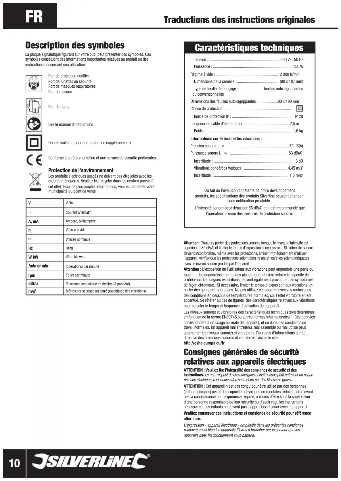 Du fait de l’évolution constante de notre développement produits, les spécifications des produits Silverline peuvent changer sans notification préalable.L’intensité sonore peut dépasser 85 dB(A) et il est recommandé que l’opérateur prenne des mesures de protection sonore. Description des symboles La plaque signalétique figurant sur votre outil peut présenter des symboles. Ces symboles constituent des informations importantes relatives au produit ou des instructions concernant son utilisation. Port de protection auditivePort de lunettes de sécurité Port de masques respiratoiresPort du casque Port de gants Lire le manuel d’instructions Double isolation pour une protection supplémentaire