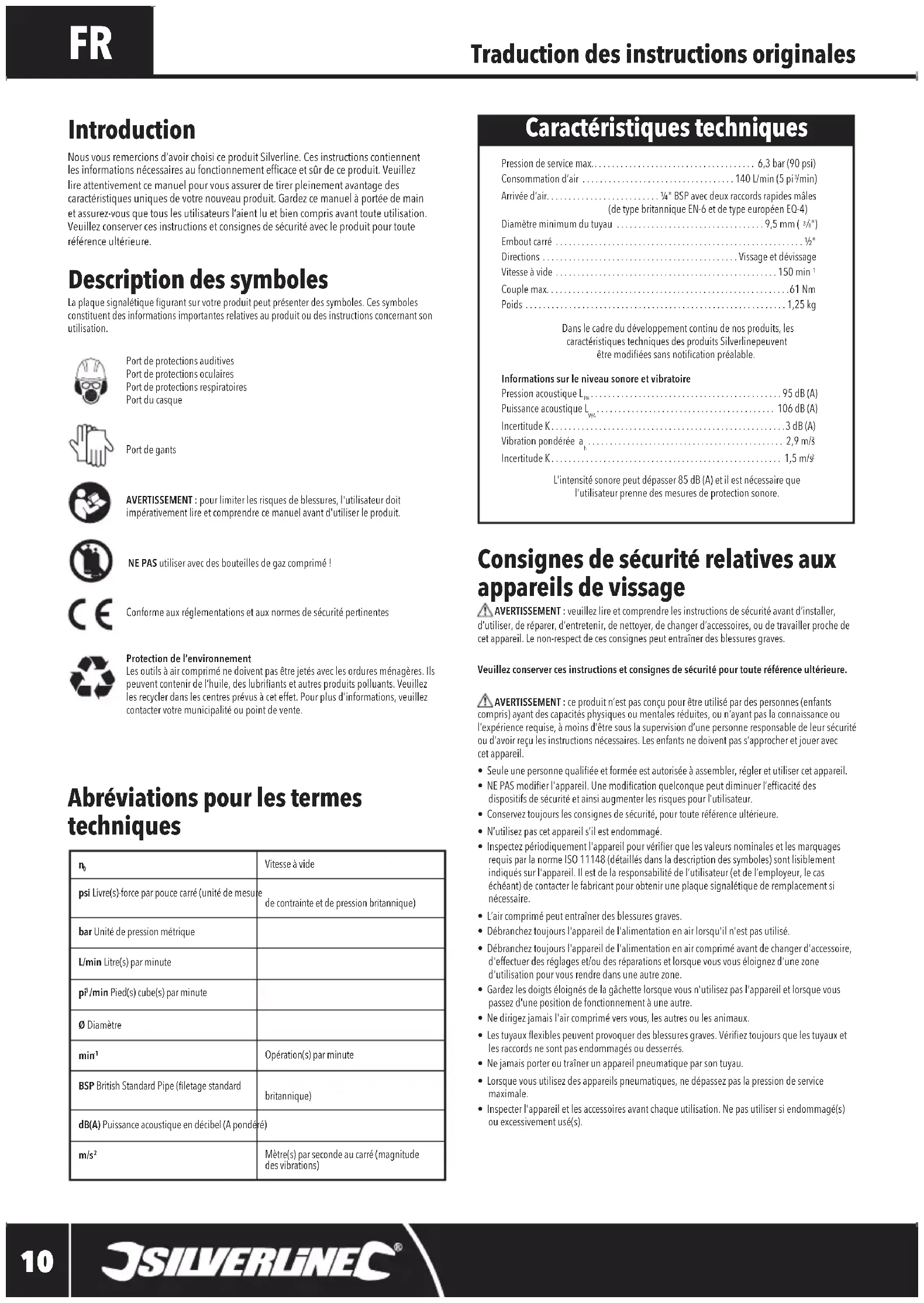 d’utiliser, de réparer, d’entretenir, de nettoyer, de changer d’accessoires, ou de travailler proche de cet appareil. Le non-respect de ces consignes peut entraîner des blessures graves.Veuillez conserver ces instructions et consignes de sécurité pour toute référence ultérieure. AVERTISSEMENT : ce produit n’est pas conçu pour être utilisé par des personnes (enfants compris) ayant des capacités physiques ou mentales réduites, ou n’ayant pas la connaissance ou l’expérience requise, à moins d’être sous la supervision d’une personne responsable de leur sécurité ou d’avoir reçu les instructions nécessaires. Les enfants ne doivent pas s’approcher et jouer avec cet appareil.• Seule une personne qualiée et formée est autorisée à assembler, régler et utiliser cet appareil.• NE PAS modier l'appareil. Une modication quelconque peut diminuer l’efcacité des dispositifs de sécurité et ainsi augmenter les risques pour l’utilisateur.• Conservez toujours les consignes de sécurité, pour toute référence ultérieure.• N’utilisez pas cet appareil s’il est endommagé.• Inspectez périodiquement l'appareil pour vérier que les valeurs nominales et les marquages requis par la norme ISO 11148 (détaillés dans la description des symboles) sont lisiblement indiqués sur l'appareil. Il est de la responsabilité de l’utilisateur (et de l’employeur, le cas échéant) de contacter le fabricant pour obtenir une plaque signalétique de remplacement si nécessaire.• L’air comprimé peut entraîner des blessures graves.• Débranchez toujours l'appareil de l'alimentation en air lorsqu'il n'est pas utilisé.• Débranchez toujours l'appareil de l'alimentation en air comprimé avant de changer d'accessoire, d'effectuer des réglages et/ou des réparations et lorsque vous vous éloignez d'une zone d'utilisation pour vous rendre dans une autre zone.• Gardez les doigts éloignés de la gâchette lorsque vous n'utilisez pas l'appareil et lorsque vous passez d'une position de fonctionnement à une autre.• Ne dirigez jamais l'air comprimé vers vous, les autres ou les animaux.• Les tuyaux exibles peuvent provoquer des blessures graves. Vériez toujours que les tuyaux et les raccords ne sont pas endommagés ou desserrés.• Ne jamais porter ou traîner un appareil pneumatique par son tuyau.• Lorsque vous utilisez des appareils pneumatiques, ne dépassez pas la pression de service maximale.• Inspecter l'appareil et les accessoires avant chaque utilisation. Ne pas utiliser si endommagé(s) ou excessivement usé(s). Introduction Nous vous remercions d’avoir choisi ce produit Silverline. Ces instructions contiennent les informations nécessaires au fonctionnement efficace et sûr de ce produit. Veuillez lire attentivement ce manuel pour vous assurer de tirer pleinement avantage des caractéristiques uniques de votre nouveau produit. Gardez ce manuel à portée de main et assurez-vous que tous les utilisateurs l’aient lu et bien compris avant toute utilisation. Veuillez conserver ces instructions et consignes de sécurité avec le produit pour toute référence ultérieure.