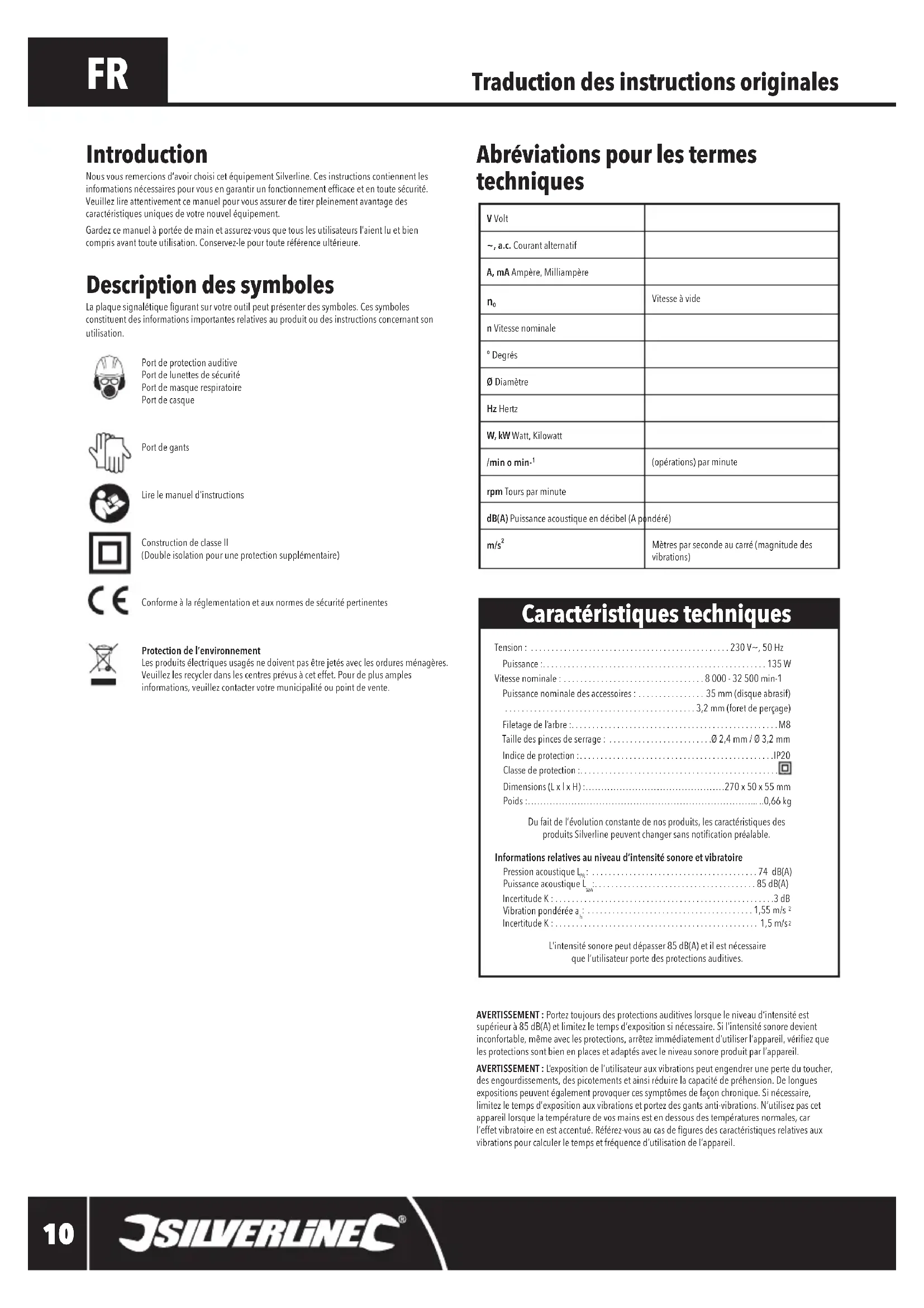 desengourdissements,despicotementsetainsiréduirelacapacitédepréhension.Delonguesexpositionspeuventégalementprovoquercessymptômesdefaçonchronique.Sinécessaire,limitezletempsd’expositionauxvibrationsetportezdesgantsanti-vibrations.N’utilisezpascetappareillorsquelatempératuredevosmainsestendessousdestempératuresnormales,carl’effetvibratoireenestaccentué.Référez-vousaucasdeguresdescaractéristiquesrelativesauxvibrationspourcalculerletempsetfréquenced’utilisationdel’appareil. Abréviations pour les termes techniques Introduction Nousvousremercionsd’avoirchoisicetéquipementSilverline.Cesinstructionscontiennentlesinformationsnécessairespourvousengarantirunfonctionnementefcaceetentoutesécurité.Veuillezlireattentivementcemanuelpourvousassurerdetirerpleinementavantagedescaractéristiquesuniquesdevotrenouveléquipement.Gardezcemanuelàportéedemainetassurez-vousquetouslesutilisateursl’aientluetbiencomprisavanttouteutilisation.Conservez-lepourtouteréférenceultérieure. Traduction des instructions originales Description des symboles Laplaquesignalétiquegurantsurvotreoutilpeutprésenterdessymboles.Cessymbolesconstituentdesinformationsimportantesrelativesauproduitoudesinstructionsconcernantsonutilisation.Portdeprotectionauditive Portdelunettesdesécurité Portdemasquerespiratoire PortdecasquePortdegantsLirelemanueld’instructionsConstructiondeclasseII (Doubleisolationpouruneprotectionsupplémentaire)ConformeàlaréglementationetauxnormesdesécuritépertinentesProtection de l’environnement Lesproduitsélectriquesusagésnedoiventpasêtrejetésaveclesorduresménagères.Veuillezlesrecyclerdanslescentresprévusàceteffet.Pourdeplusamplesinformations,veuillezcontactervotremunicipalitéoupointdevente.V Volt~, a.c. Courant alternatifA, mA Ampère,Milliampère