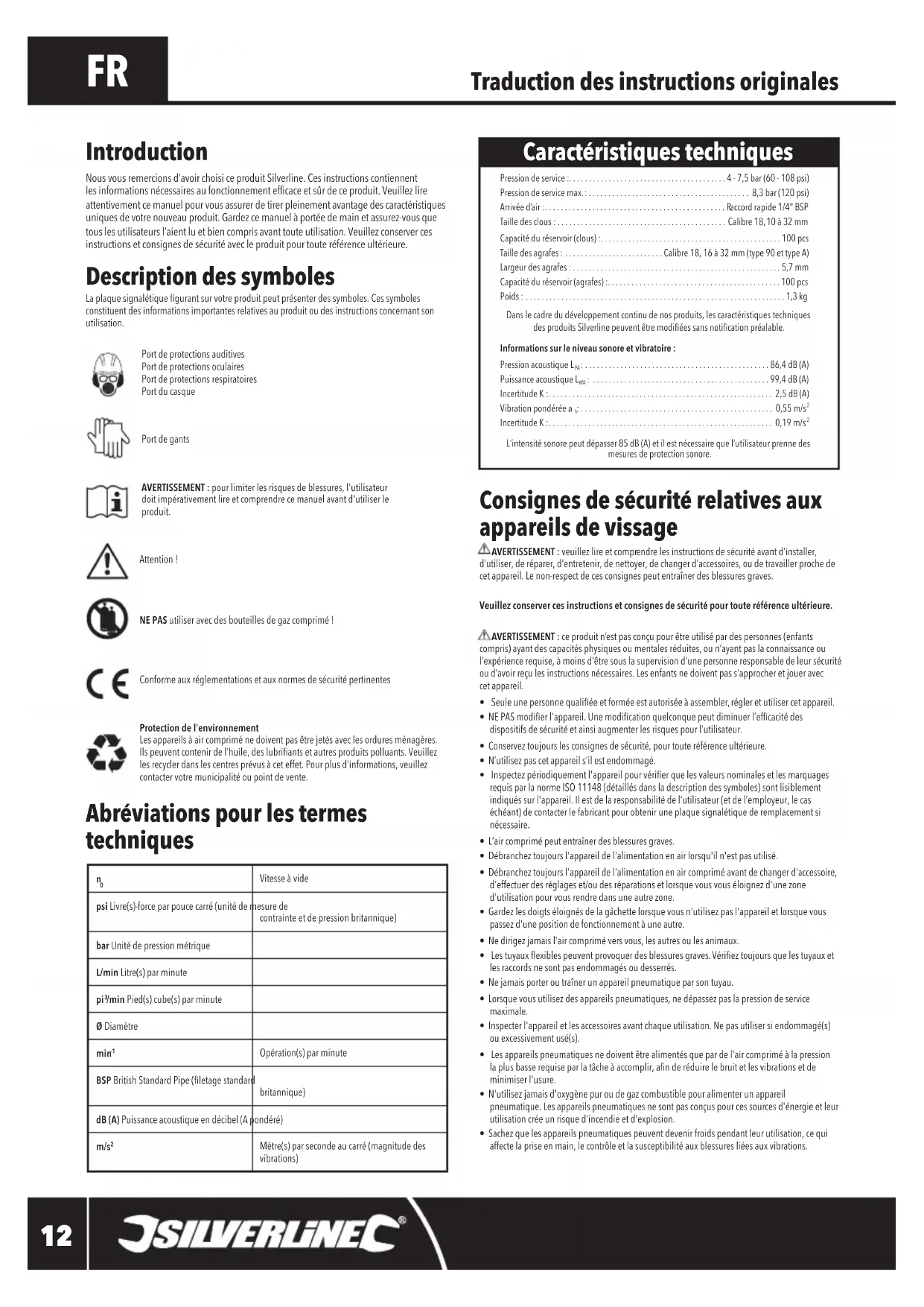 - Lesappareilspneumatiquesnedoiventêtrealimentésquepardel'aircompriméàlapression laplusbasserequiseparlatâcheàaccomplir,anderéduirelebruitetlesvibrationsetdeminimiser l'usure.• N'utilisez jamais d'oxygène pur ou de gaz combustible pour alimenter un appareil pneumatique.Lesappareilspneumatiquesnesontpasconçuspourcessourcesd'énergieetleurutilisation crée un risque d'incendie et d'explosion.• Sachez que les appareils pneumatiques peuvent devenir froids pendant leur utilisation, ce qui affecte la prise en main, le contrôle et la susceptibilité aux blessures liées aux vibrations. Introduction Nousvousremercionsd’avoirchoisiceproduitSilverline.Cesinstructionscontiennentlesinformationsnécessairesaufonctionnementefficaceetsûrdeceproduit.Veuillezlireattentivement ce manuel pour vous assurer de tirer pleinement avantage des caractéristiques uniquesdevotrenouveauproduit.Gardezcemanuelàportéedemainetassurez-vousquetouslesutilisateursl’aientluetbiencomprisavanttouteutilisation.Veuillezconservercesinstructions et consignes de sécurité avec le produit pour toute référence ultérieure. Description des symboles Laplaquesignalétiquegurantsurvotreproduitpeutprésenterdessymboles.Cessymbolesconstituent des informations importantes relatives au produit ou des instructions concernant son utilisation.Port de protections auditives Port de protections oculaires Port de protections respiratoires Port du casquePort de gantsAVERTISSEMENT : pour limiter les risques de blessures, l'utilisateur doit impérativement lire et comprendre ce manuel avant d'utiliser le produit. Attention ! NE PAS utiliser avec des bouteilles de gaz comprimé !Conforme aux réglementations et aux normes de sécurité pertinentes Protection de l’environnement Lesappareilsàaircompriménedoiventpasêtrejetésaveclesorduresménagères.Ilspeuventcontenirdel’huile,deslubriantsetautresproduitspolluants.Veuillezlesrecyclerdanslescentresprévusàceteffet.Pourplusd'informations,veuillezcontacter votre municipalité ou point de vente. Abréviations pour les termes techniques