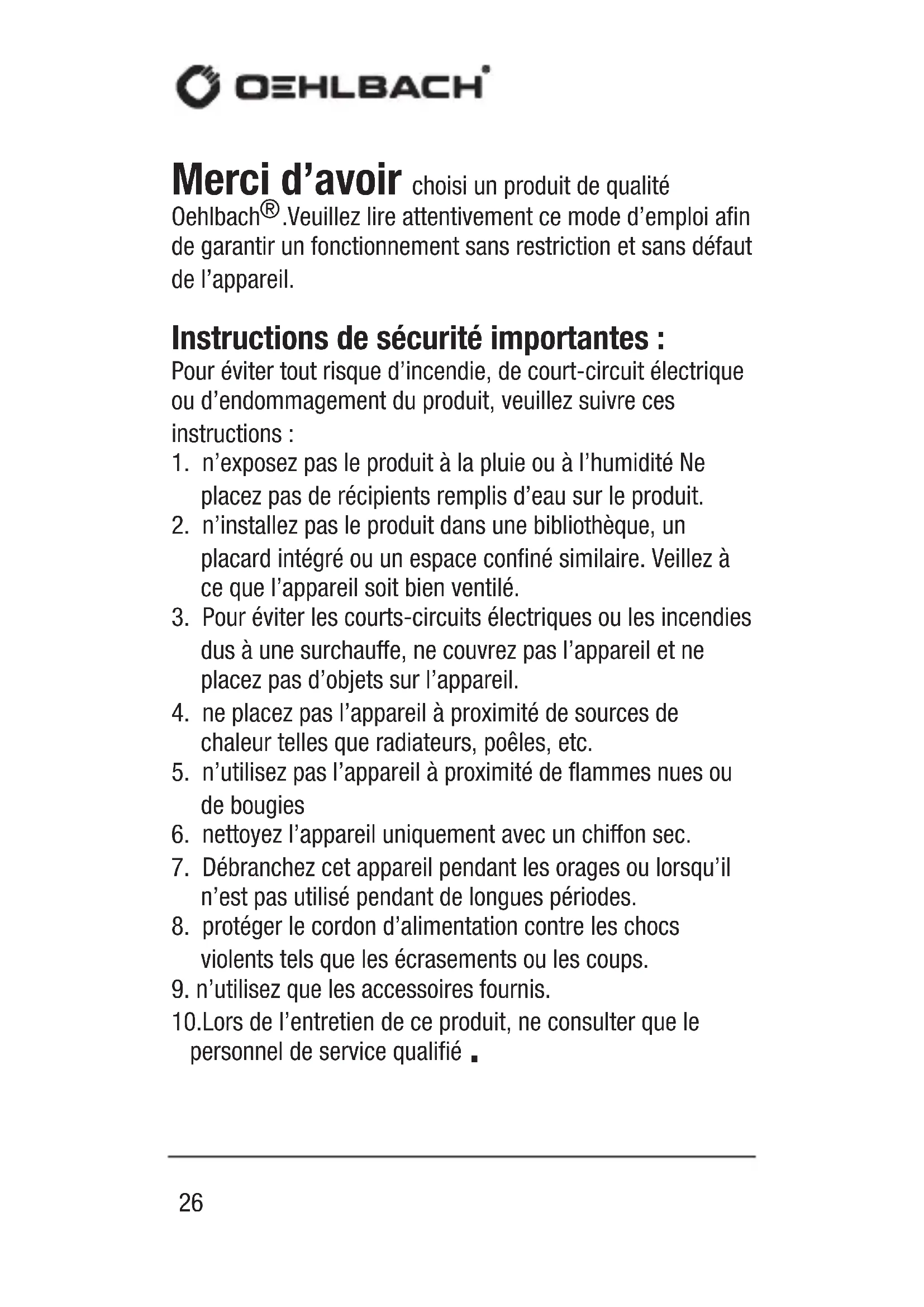 .Veuillez lire attentivement ce mode d’emploi afin de garantir un fonctionnement sans restriction et sans défaut de l’appareil. Instructions de sécurité importantes : Pour éviter tout risque d’incendie, de court-circuit électrique ou d’endommagement du produit, veuillez suivre ces instructions :
