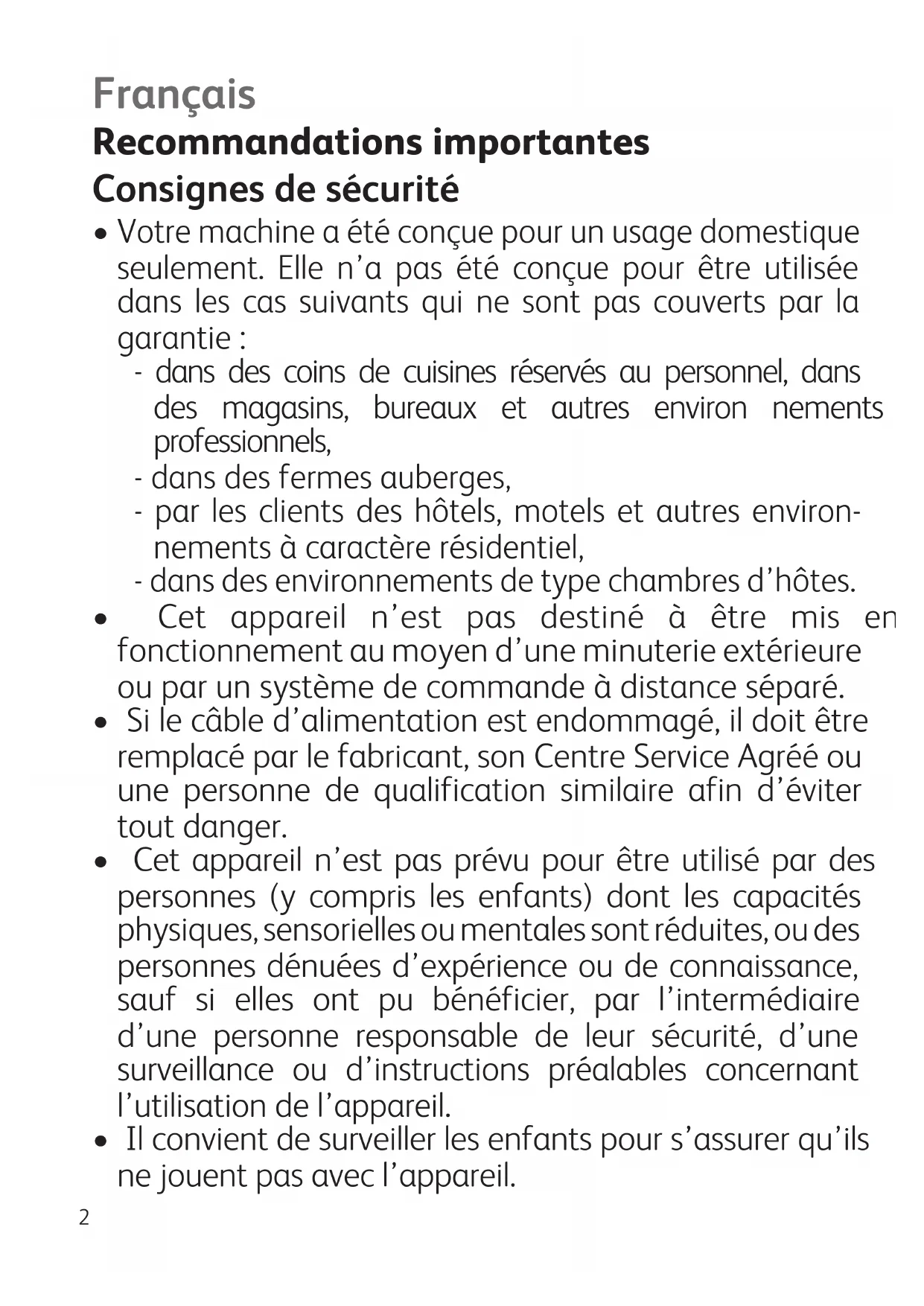 Votre machine a été conçue pour un usage domestique seulement. Elle n’a pas été conçue pour être utilisée dans les cas suivants qui ne sont pas couverts par la garantie : - dans des coins de cuisines réservés au personnel, dans des magasins, bureaux et autres environ nements professionnels, - dans des fermes auberges, - par les clients des hôtels, motels et autres environ- nements à caractère résidentiel, - dans des environnements de type chambres d’hôtes.