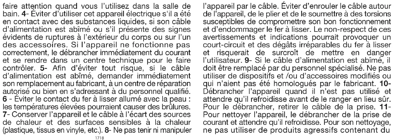 proximité de l’eau pourrait représenter un danger ; 15 16faire attention quand vous l’utilisez dans la salle de bain. 4- Éviter d’utiliser cet appareil électrique s'il a été en contact avec des substances liquides, si son câble d’alimentation est abîmé ou s’il présente des signes évidents de ruptures à l’extérieur du corps ou sur l’un des accessoires. Si l’appareil ne fonctionne pas correctement, le débrancher immédiatement du courant et se rendre dans un centre technique pour le faire contrôler. 5- Afin d’éviter tout risque, si le câble d’alimentation est abîmé, demander immédiatement son remplacement au fabricant, à un centre de réparation autorisé ou bien en s’adressant à du personnel qualifié.