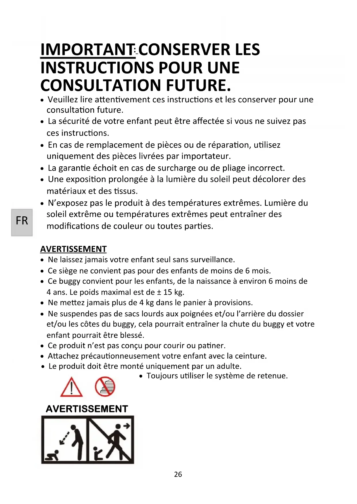 - Ne laissez jamais votre enfant seul sans surveillance. • Ce siège ne convient pas pour des enfants de moins de 6 mois. • Ce buggy convient pour les enfants, de la naissance à environ 6 moins de 4 ans. Le poids maximal est de ± 15 kg.