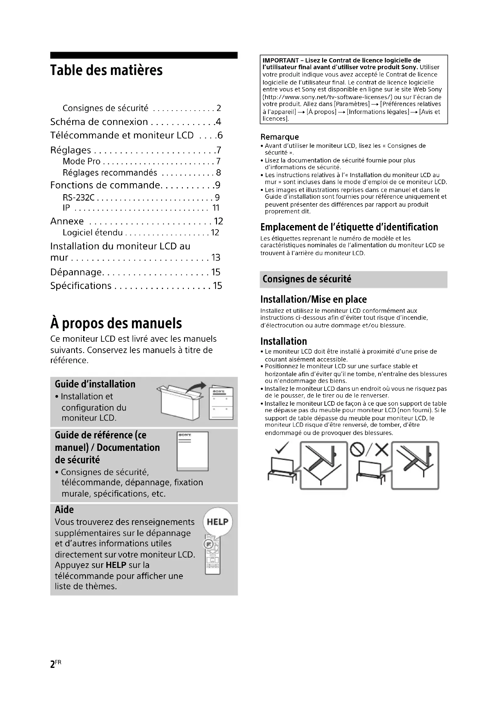 - Le moniteur LCD doit être installé à proximité d’une prise de courant aisément accessible.• Positionnez le moniteur LCD sur une surface stable et hor izontale afin d’éviter qu’il ne tombe, n’entraîne des blessures ou n’endommage des biens.• Installez le moniteur LCD dans un endroit où vous ne risquez pas de le pousser, de le tirer ou de le renverser.• Installez le moniteur LCD de façon à ce que son support de table ne dépasse pas du meuble pour moniteur LCD (non fourni). Si le support de table dépasse du meuble pour moniteur LCD, le moniteur LCD risque d’être renversé, de tomber, d’être endommagé ou de provoquer des blessures. À propos des manuels Ce moniteur LCD est livré avec les manuels suivants. Conservez les manuels à titre de référence. Guide d’installation
