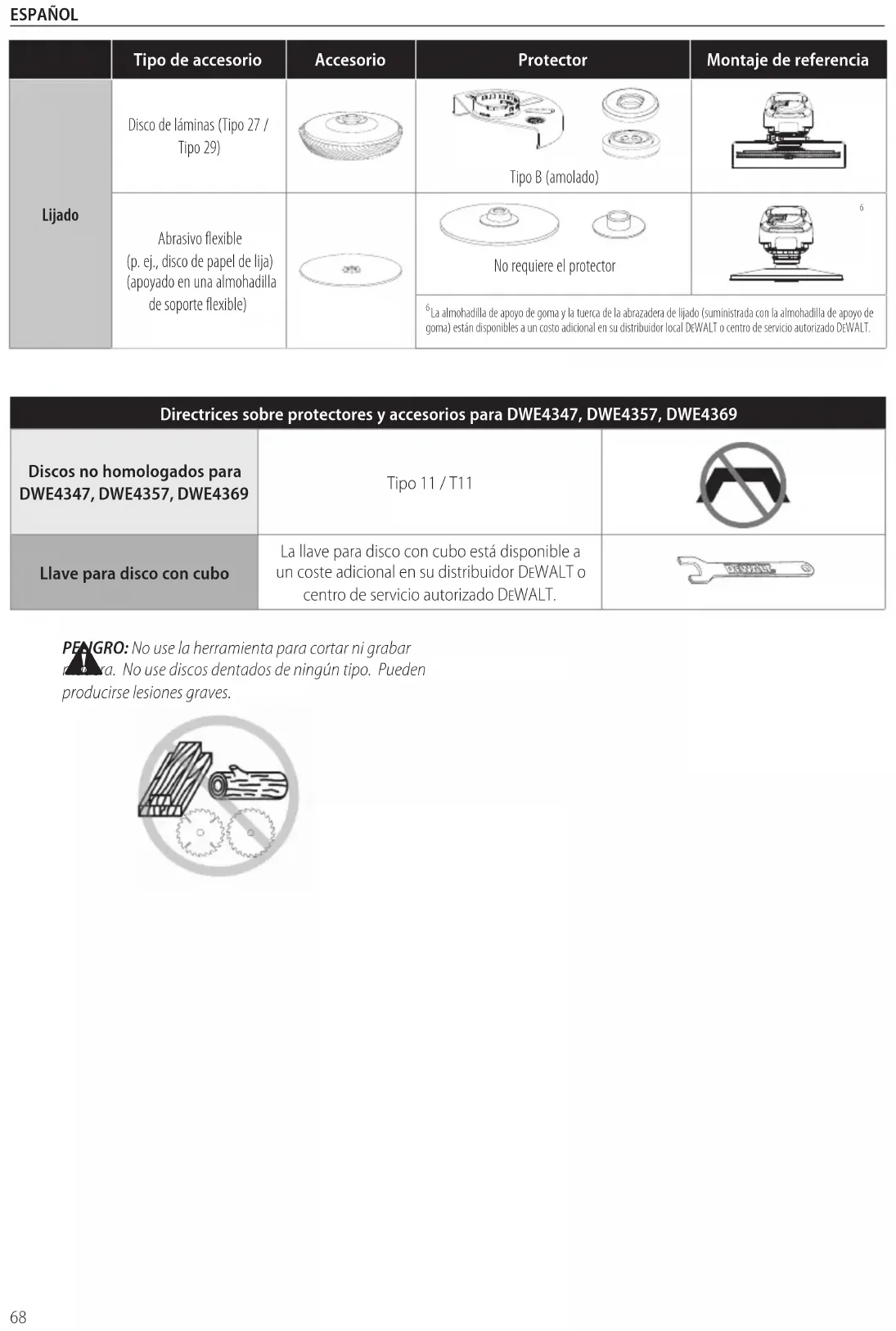 Référence pour la bonne géométrie du disque diamant Tableau Informations supplémentaires propres aux carters de protection et aux accessoires. Disques abrasifs pour les matériaux autres que le métal ou les matériaux de maçonnerie/béton Type A (Découpe fermée) Double usage (Découpe et meulage) Disque abrasif double usage Type A (Découpe fermée) Brossage métallique Disque type brosse métallique Type A ou Type B (Découpe fermée ou meulage) Boisseau type brosse métallique Carter de protection inutile85 FRANÇAIS Directives propres aux carters de protection et aux accessoires pour DWE4347, DWE4357, DWE4369 Disques non approuvés pour