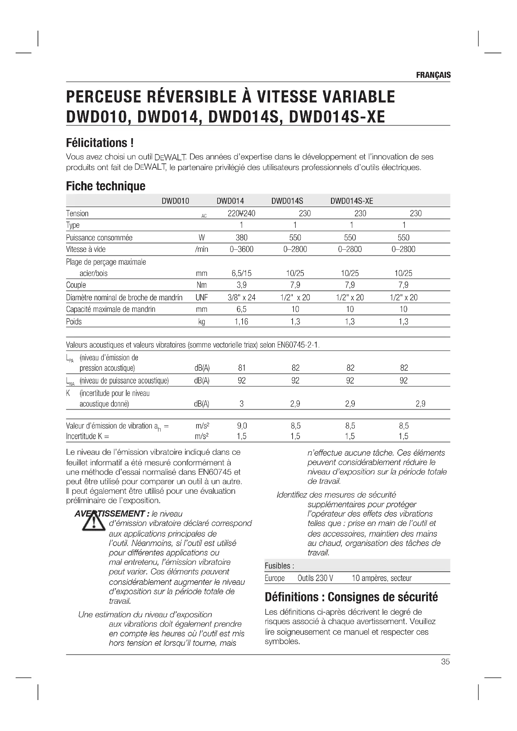 Français (traduction de la notice d’instructions originale) n’effectue aucune tâche. Ces éléments peuvent considérablement réduire le niveau d’exposition sur la période totale de travail. Identifiez des mesures de sécurité supplémentaires pour protéger l’opérateur des effets des vibrations telles que: prise en main de l’outil et des accessoires, maintien des mains au chaud, organisation des tâches de travail. Fusibles: Europe Outils 230V 10 ampères, secteur Définitions: Consignes de sécurité Les définitions ci-après décrivent le degré de risques associé à chaque avertissement. Veuillez lire soigneusement ce manuel et respecter ces symboles.36 Français Markus Rompel Directeur Ingénierie DeWALT , Richard-Klinger-Strase 11, D-65510, Idstein, Allemagne