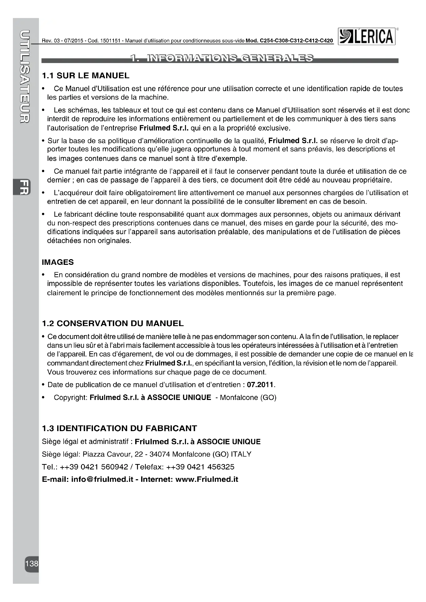 Rev. 03 - 07/2015 - Cod. 1501151 - Manuel d’utilisation pour conditionneuses sous-vide Mod. C254-C308-C312-C412-C420 dEClaRatION dE CONFORmItE CE L’entrepriseFriulmed S.r.l. à associé unique, Piazza Cavour, 22 – 34074 MONFALCONE (GO) – Italie, déclaresoussapropreresponsabilitéquelesproduits: Conditionneuses sous-vide C254, C308, C310, C312, C412, C420 auxquelsseréfèrecettedéclarationsontfabriquésconformémentaux:
