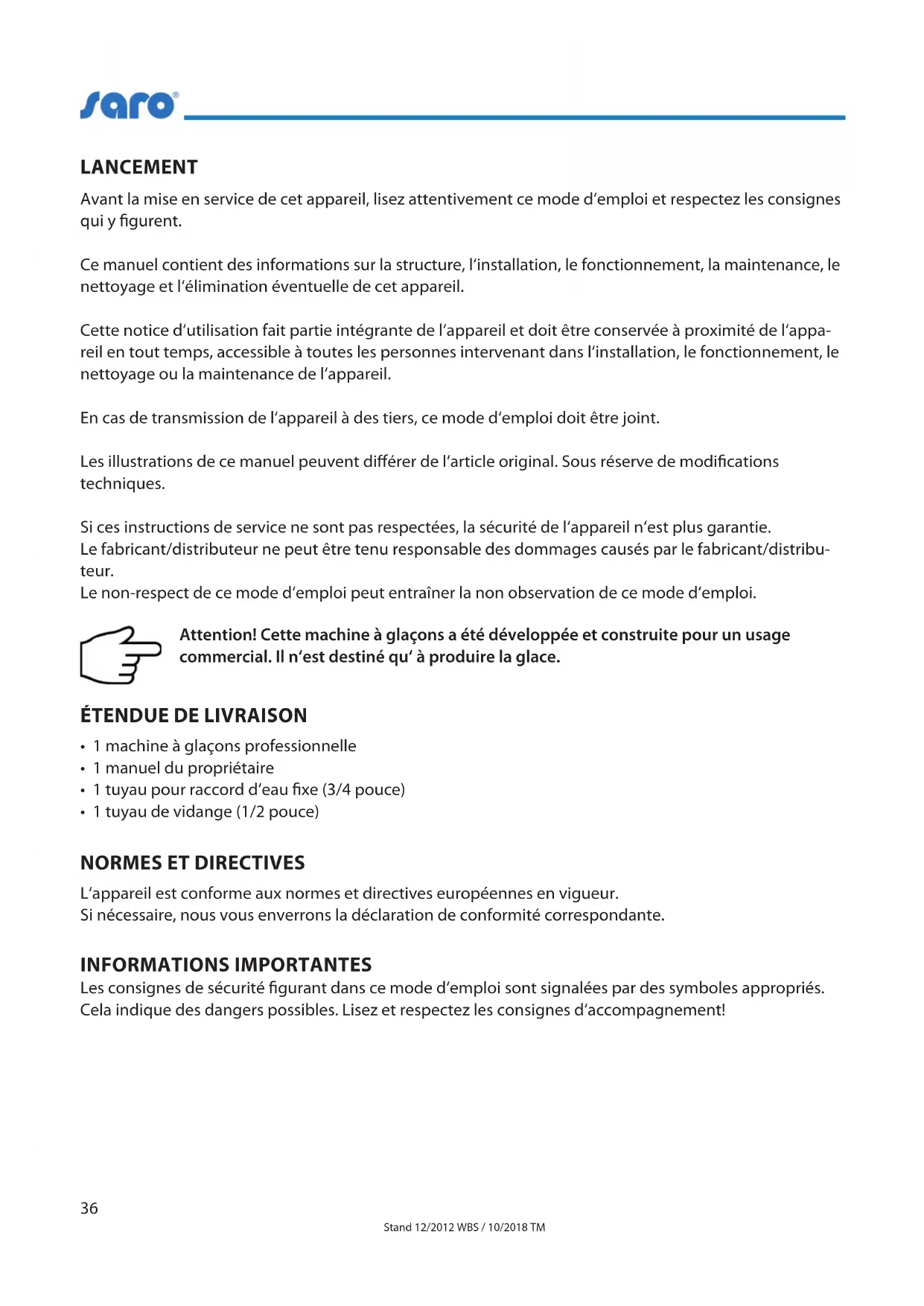 - Errors Possible causes Solutions The appliance does not work Problems with the main electricity connection. Ambient temperature is under 10°C. Switch o and after 5 minutes restart. Restart, if the ambient temperature is higher. Warning lamp for to less water lights up Water intake disturbed Valve is damaged. Water pressure is too low. Check the water intake Check valve, if necessary, let it exchange. The water pressure has to be at least 1 kg/cm2. The condenser does not work Not enough water. Ice collector container is full. Check the water supply. Empty the container. The condenser works, but no ice cubes are produced Leak in the cooling system. Condenser dusty. Kühlsystem vom Fachmann überprüfen lassen. Kondensator staubfrei machen, Lüftungsschlitze reinigen The ice cubes do not fall at all or only partially into the container Ambient temperature or water temperature are to low. Valve is damaged. Ambient temperature has to be at least 10°C and water temperature at least 7°C. Exchange the valve. The ice cubes always stick together Storage tank is not suciently cooled. Often emptying. Do not leave overnight in the storage tank. Control temperature.33 Stand 12/2012 WBS / 10/2018 TM Made in P. R. C. for SARO Gastro-Products GmbH Sandbahn 6, 46446 Emmerich am Rhein, Germany Tel. +49(0)2822 9258-0 Fax +49(0)2822 18192 E-Mail info@saro.de / www.saro.de DISPOSAL Once the device has reached the end of its useful life, please dispose of it properly at a collection point for electrical appliances. Electrical appliances should not be disposed of with household waste. Your responsible administration will inform you about the addresses and opening hours of collection points. This is the only way to ensure that old equipment is properly disposed of and recycled. Thank you very much! PACKAGING DISPOSAL Please separate the packaging materials accordingly and return them to the responsible collection points for recycling and environmental housing.34 Stand 12/2012 WBS / 10/2018 TM Cher client, merci d‘avoir choisi notre machine à glaçons. Nous espérons que vous apprécierez notre produit de pointe. Les machines à glaçons de la série „EB“ ont des caractéristiques qui vous accompagnent dans votre travail quotidien tout en protégeant l‘environnement. L‘utilisation de notre nouvelle technologie innovante garantit une longue durée de vie et réduit les coûts d‘exploitation. Niveau sonore clair. Les cônes creux ont produit un grand avantage prometteur, car ces cônes de glace creux peuvent être utilisés dans les mélangeurs sans surcharger les couteaux. De plus, tous les fabricants de glaçons disposent d‘un système de recyclage de l‘eau qui permet d‘économiser jusqu‘ à 80 % d‘eau par rapport aux autres appareils sans système de recyclage. Un réservoir isolé assure une longue durée de conservation des cônes creux. Cela réduit la consommation d‘énergie. Toute condensation qui se produit est automatiquement éliminée. Grâce à la construction compacte et aux rabats de démontage escamotables, les unités peuvent être installées dans un espace réduit et le boîtier en acier inoxydable de haute qualité permet un nettoyage facile. Dans tous les machines à glaçons, nous utilisons le uide frigorigène R 600a ou R 290, ce qui les rend respectueux de l‘environnement et sans HFC. Les machines à glaçons sont utilisées à des ns commerciales dans les hôtels, restaurants, cantines, bars, etc. Saro ne garantit pas que l‘équipement sera utilisé à d‘autres ns que celles auxquelles il est destiné. Nous espérons que vous apprécierez votre nouvelle machine à glaçons SARO!35 Stand 12/2012 WBS / 10/2018 TM CONTENU Lancement p. 36