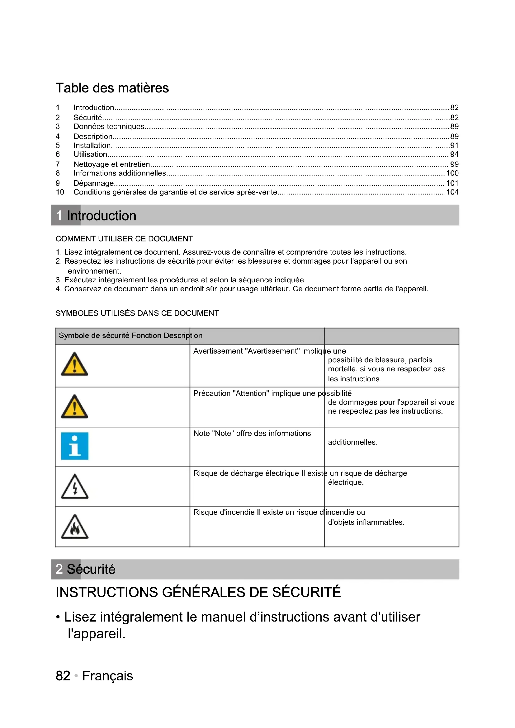 Symbole de sécurité Fonction Description Avertissement "Avertissement" implique une possibilité de blessure, parfois mortelle, si vous ne respectez pas les instructions. Précaution "Attention" implique une possibilité de dommages pour l'appareil si vous ne respectez pas les instructions. Note "Note" offre des informations additionnelles. Risque de décharge électrique Il existe un risque de décharge électrique. Risque d'incendie Il existe un risque d'incendie ou d'objets inflammables. 2 Sécurité INSTRUCTIONS GÉNÉRALES DE SÉCURITÉ