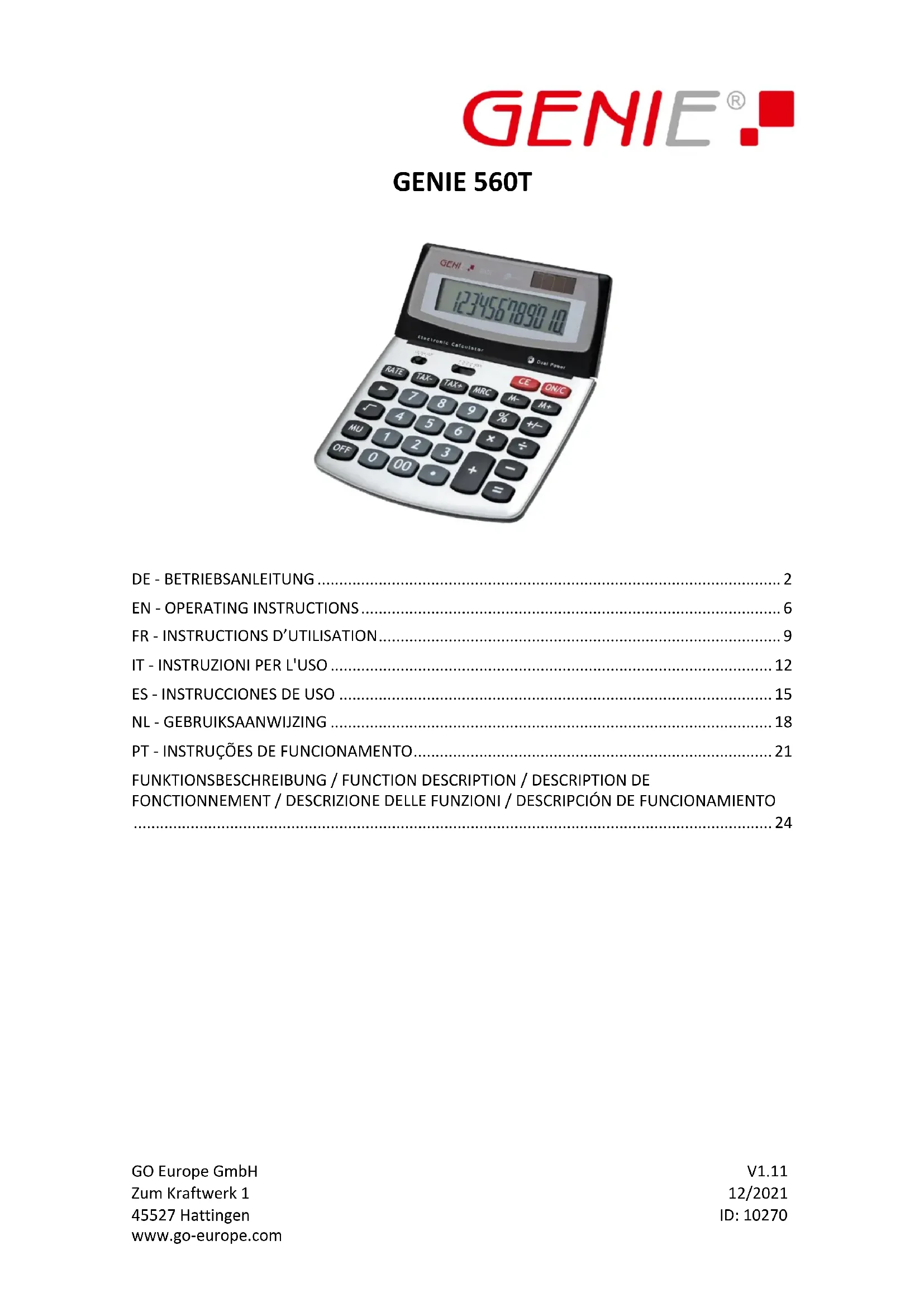 Chère cliente, cher client, Nous vous remercions d'avoir acheté ce produit de qualité de GENIE. Veuillez tout d'abord lire attentivement ce mode d'emploi avant la mise en service. Observez en particulier les conseils de prudence suivants. Veuillez conserver ce mode d'emploi pour pouvoir le consulter ultérieurement ; en cas de cession de l'article, veuillez joindre le mode d'emploi. En cas de questions sur l'appareil ou de réclamations, veuillez consulter nos informations de service à la fin de ce mode d'emploi. SÉCURITÉ Veuillez lire les instructions de sécurité suivantes. Le fabricant décline toute responsabilité pour les dommages provoqués par un non respect de ces instructions de sécurité. Veuillez conserver ce manuel avec la calculatrice pour future référence et pour pouvoir le transmettre avec le produit. Calculatrice